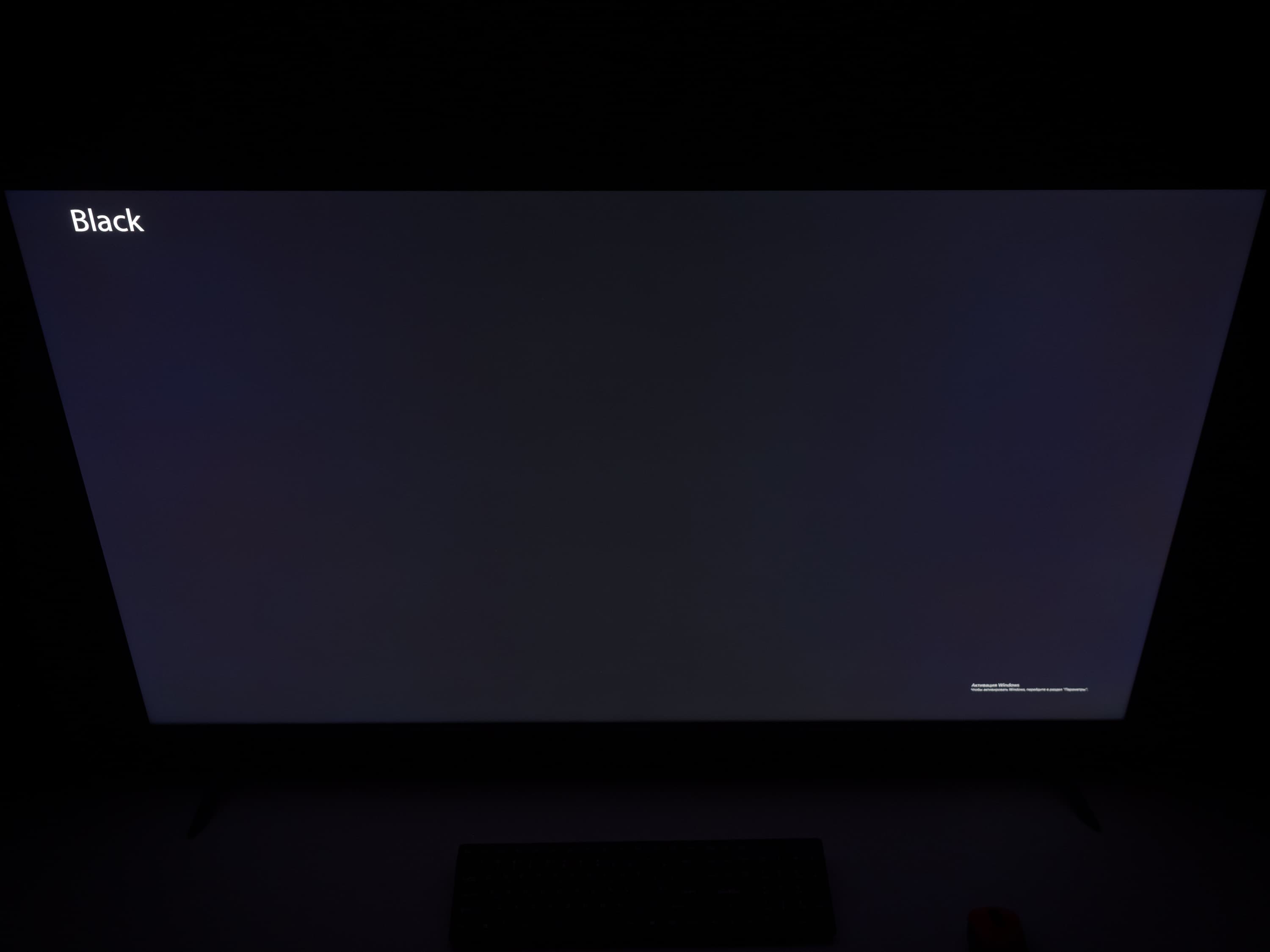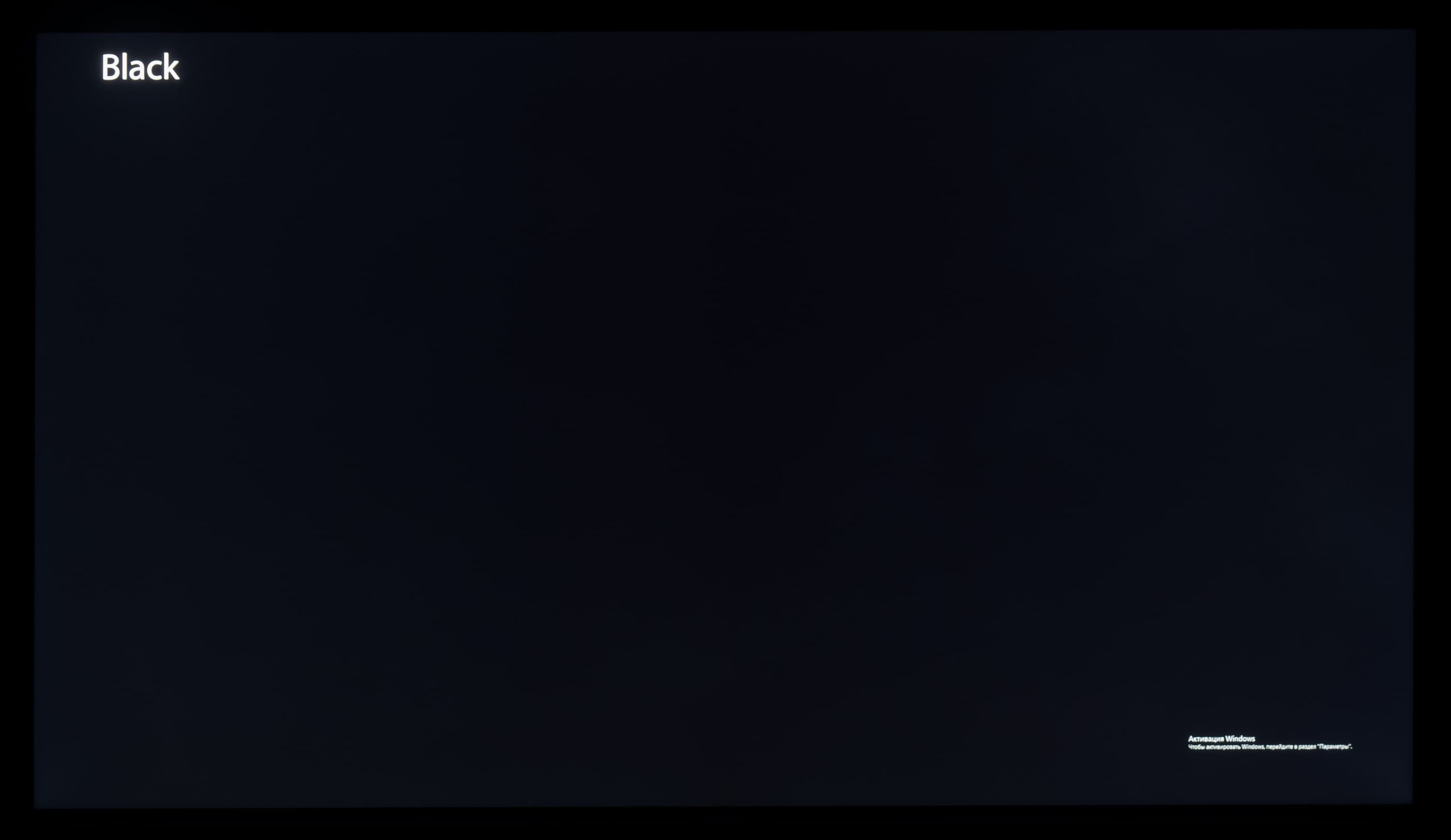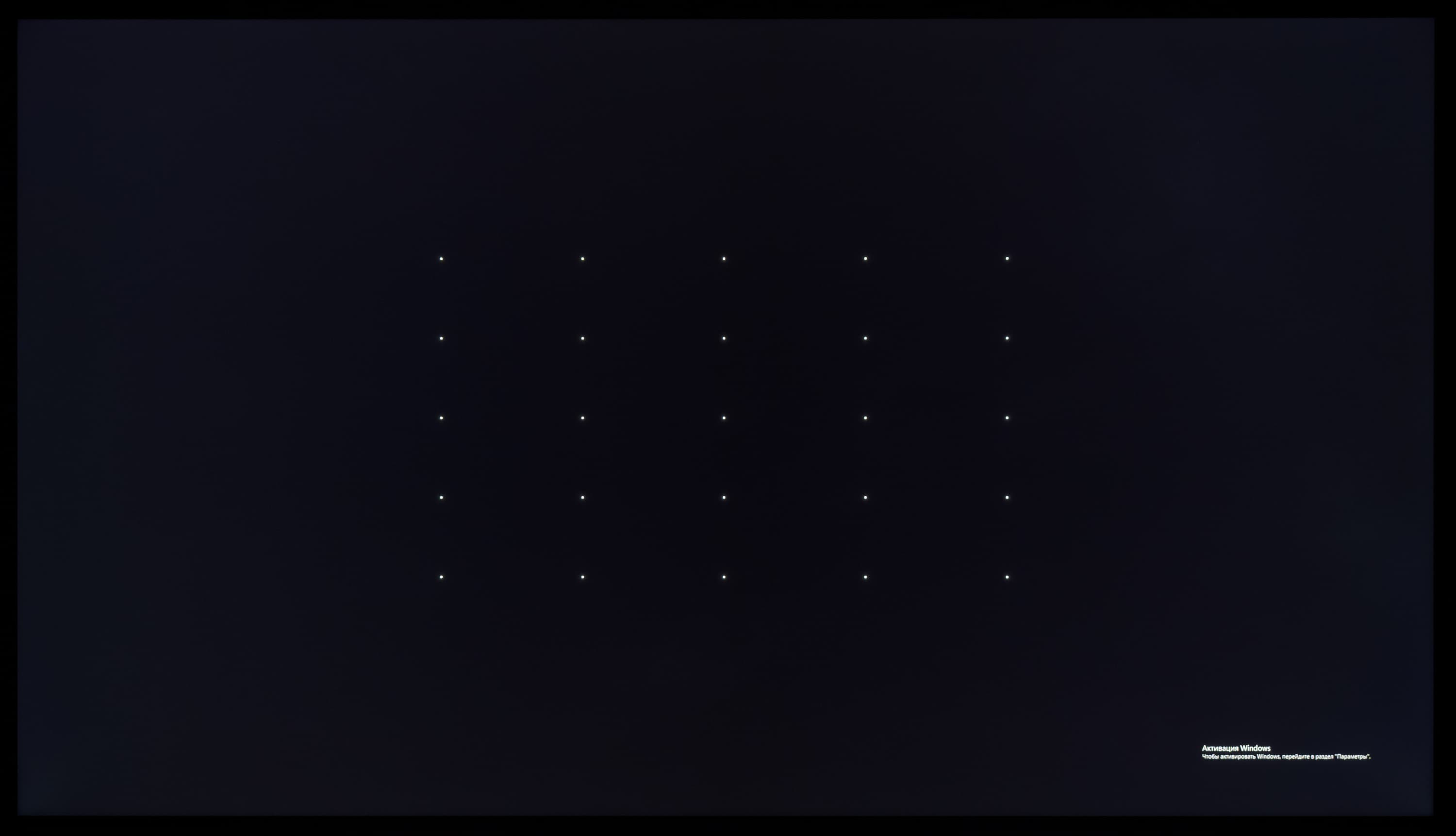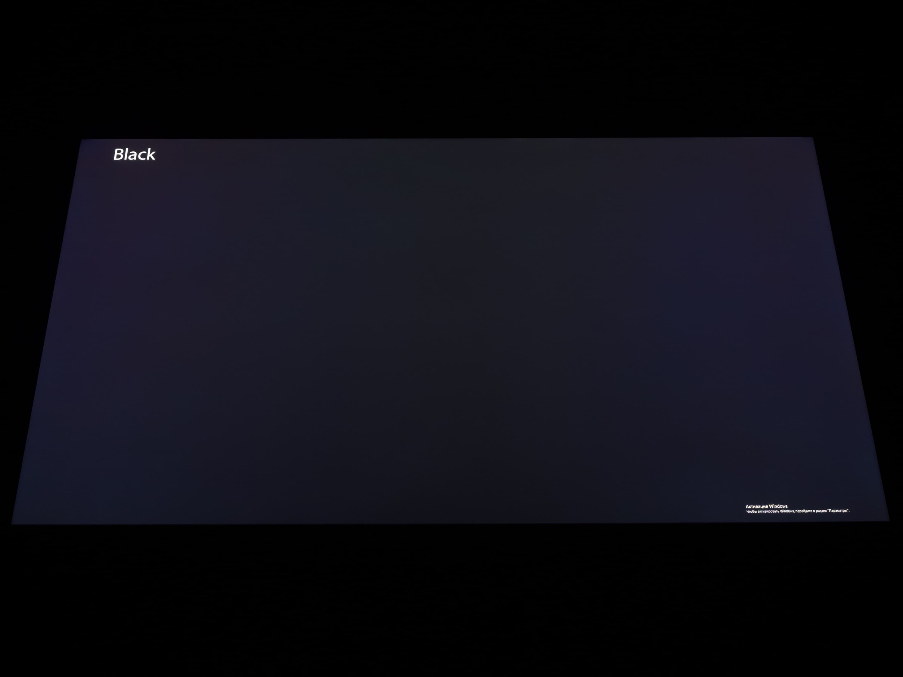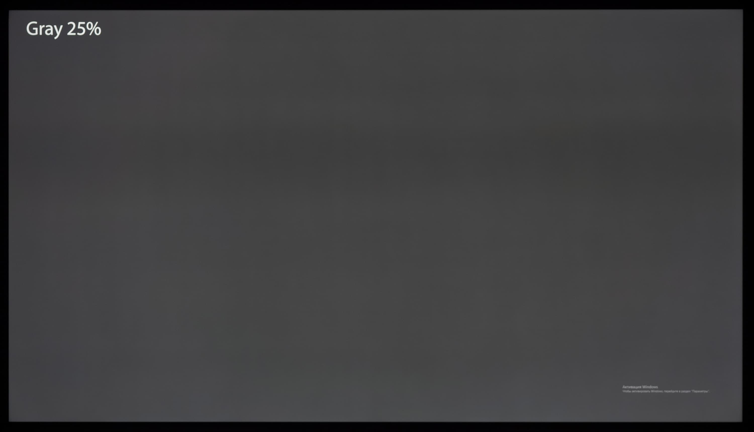 А вот при выводе черного поля равномерность подсветки оказалась очень хорошей, без визуально выраженных дефектов однородности по полю матрицы, что подтверждает фотография, сделанная с расстояния до экрана в 3 метра.
