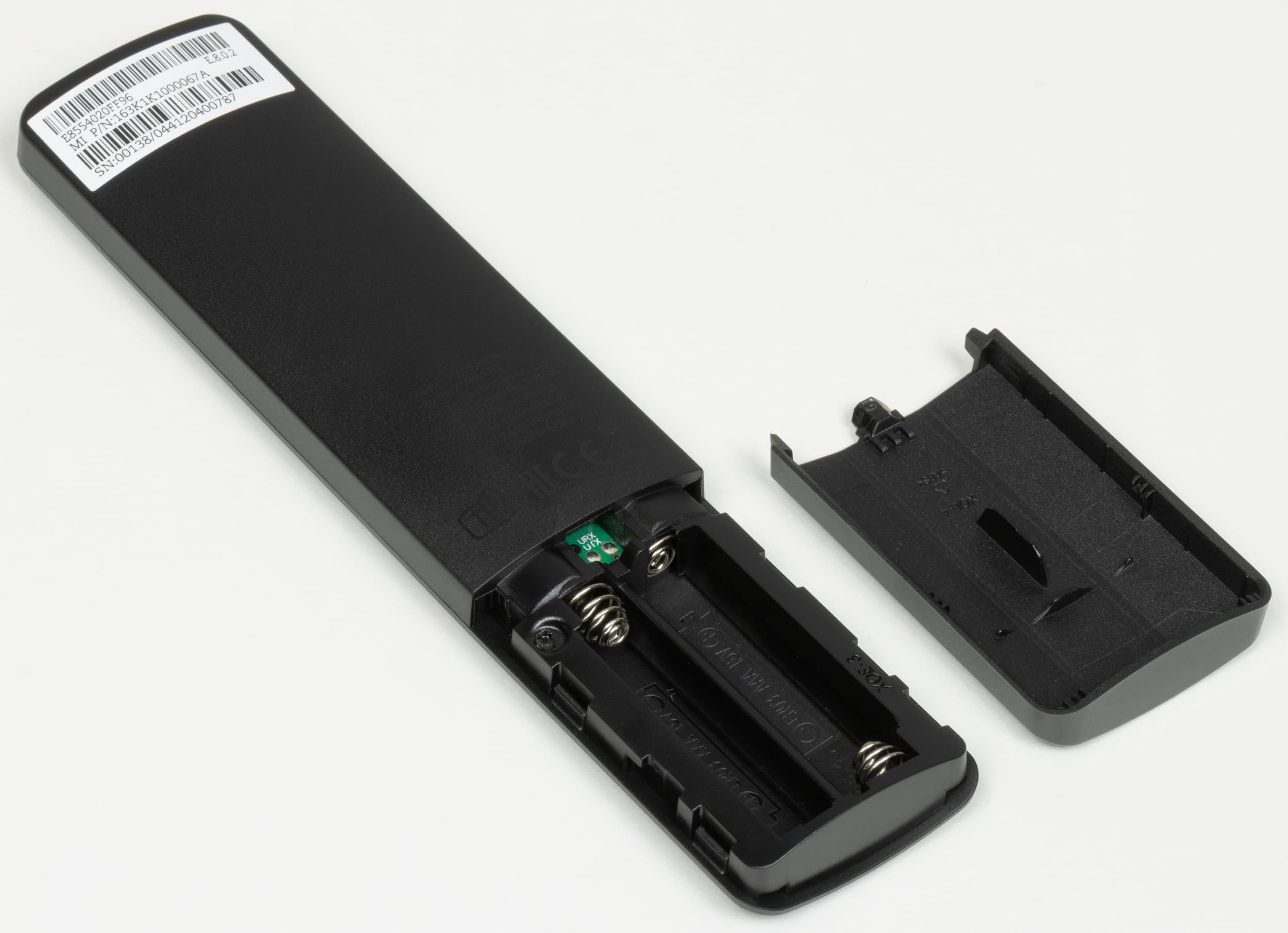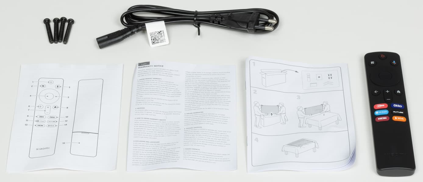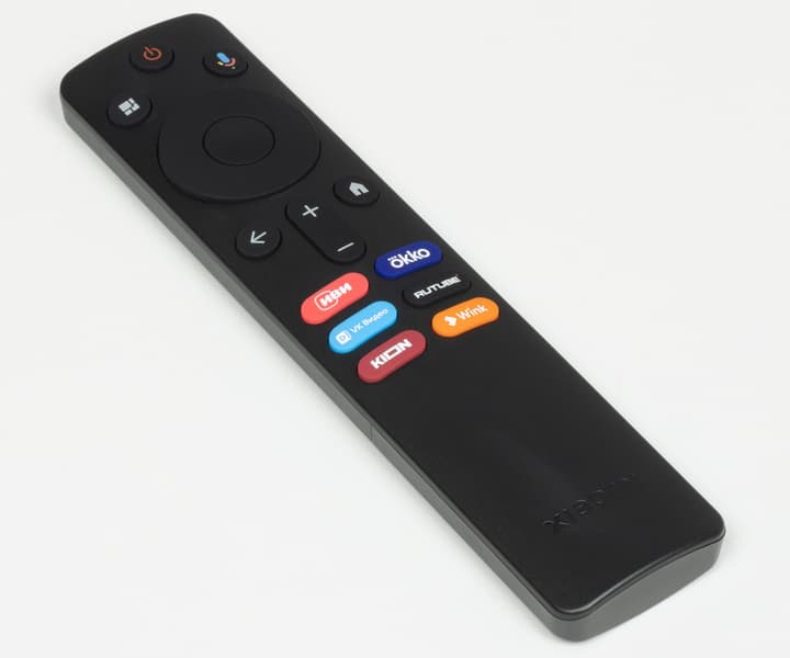 Основным элементом управления ТВ Xiaomi выступает достаточно компактный пульт ДУ. Он изготовлен из черного пластика с матовой поверхностью. Кнопки разных цветов (преимущественно черные) изготовлены из резиноподобного материала. Обозначения кнопок контрастные, основные кнопки достаточно крупные, как и надписи на них.