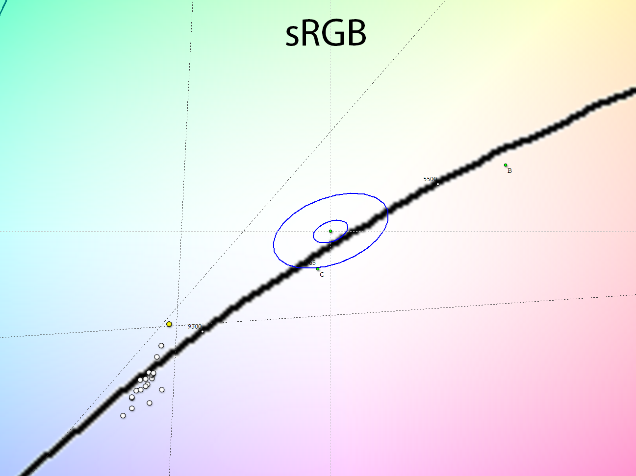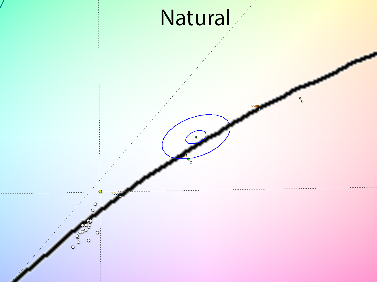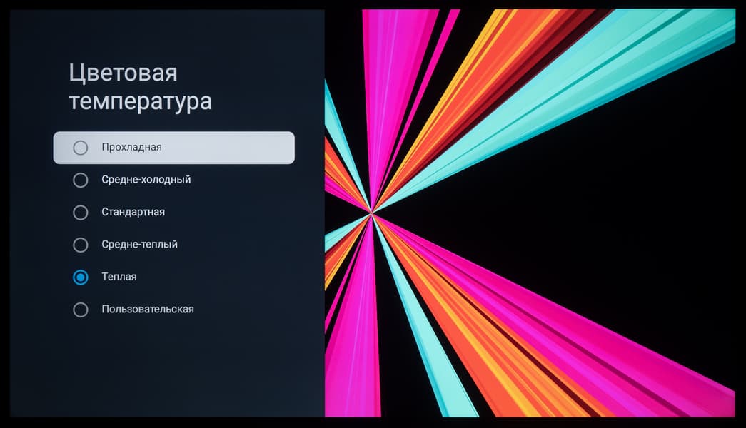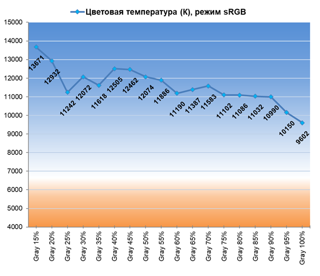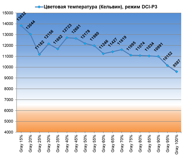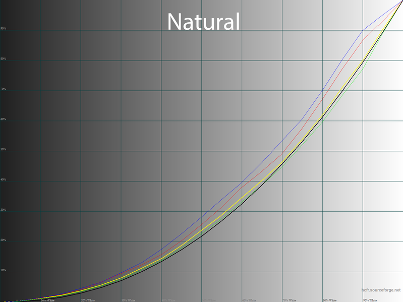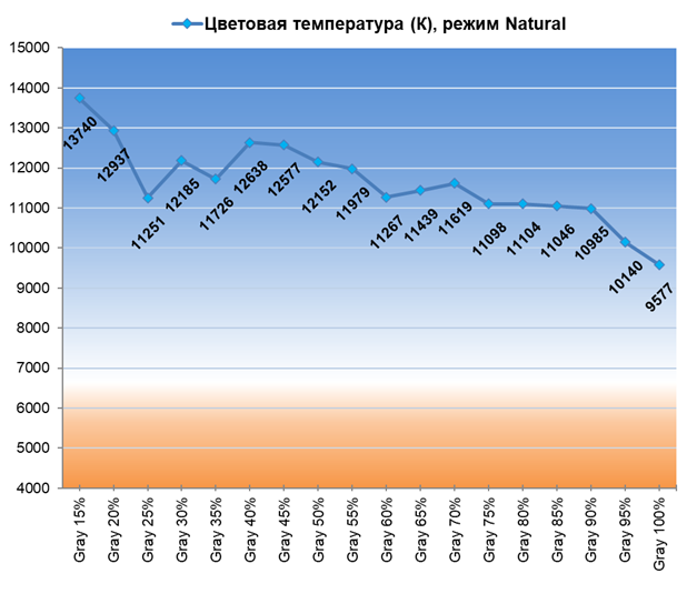 По настройкам цветовой температуры и баланса серого режиме Natural, DCI-P3 и sRGB используют одинаковые настройки ЦТ и все три обитают в диапазоне от 9500 до 13800 К — разброс существенный, стабильность серого клина очень низкая. С другой стороны, для заводских настроек большинства ЖК-телевизоров это типичная ситуация — так производители получают бо́льшую максимальную яркость и повышенный коэффициент статичной контрастности.