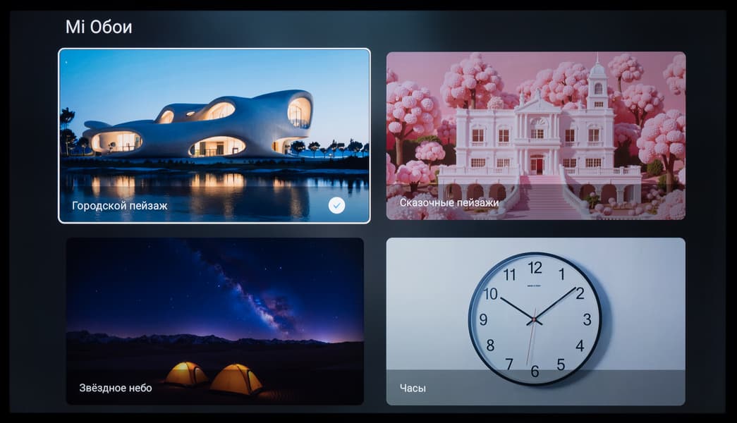 В исследуемом ТВ установлено знакомое потребителям ТВ-приставок и стиков Xiaomi приложение Xiaomi TV+, предлагающее бесплатный доступ к небольшому списку IPTV-каналов. Есть встроенные обои-заставки в разделе «Мi Обои».