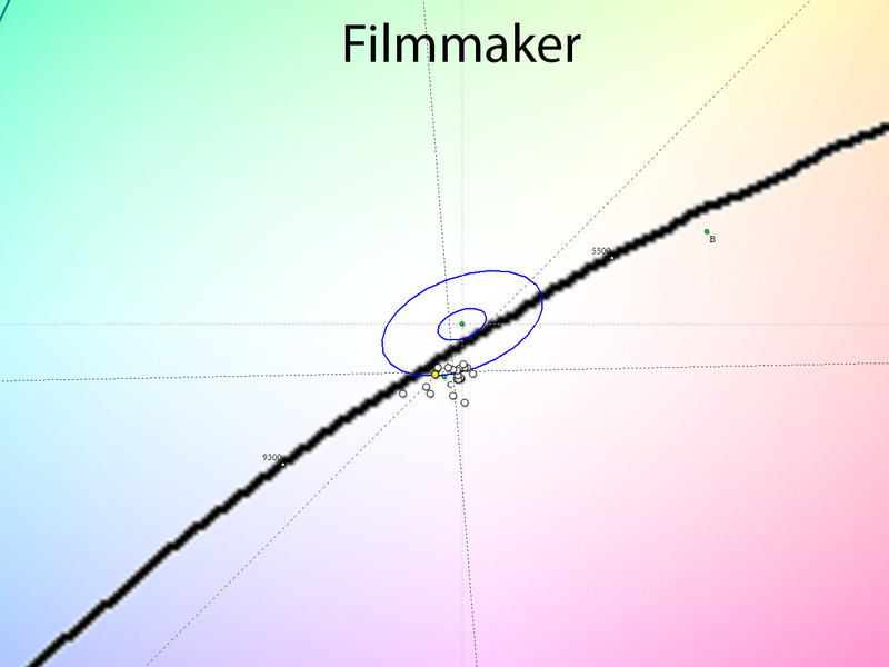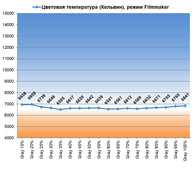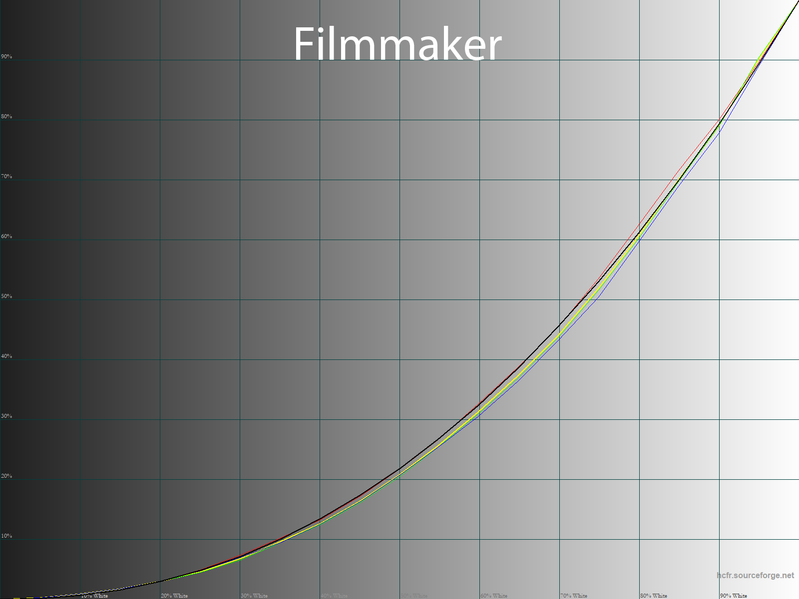 При переходе в предустановленный режим Filmmaker происходят чудеса: баланс ЦТ оттенков серого становится в разы лучше — на графике выше это хорошо видно. Цветовая температура устанавливается на уровне в 6700 К в среднем — отличный результат.