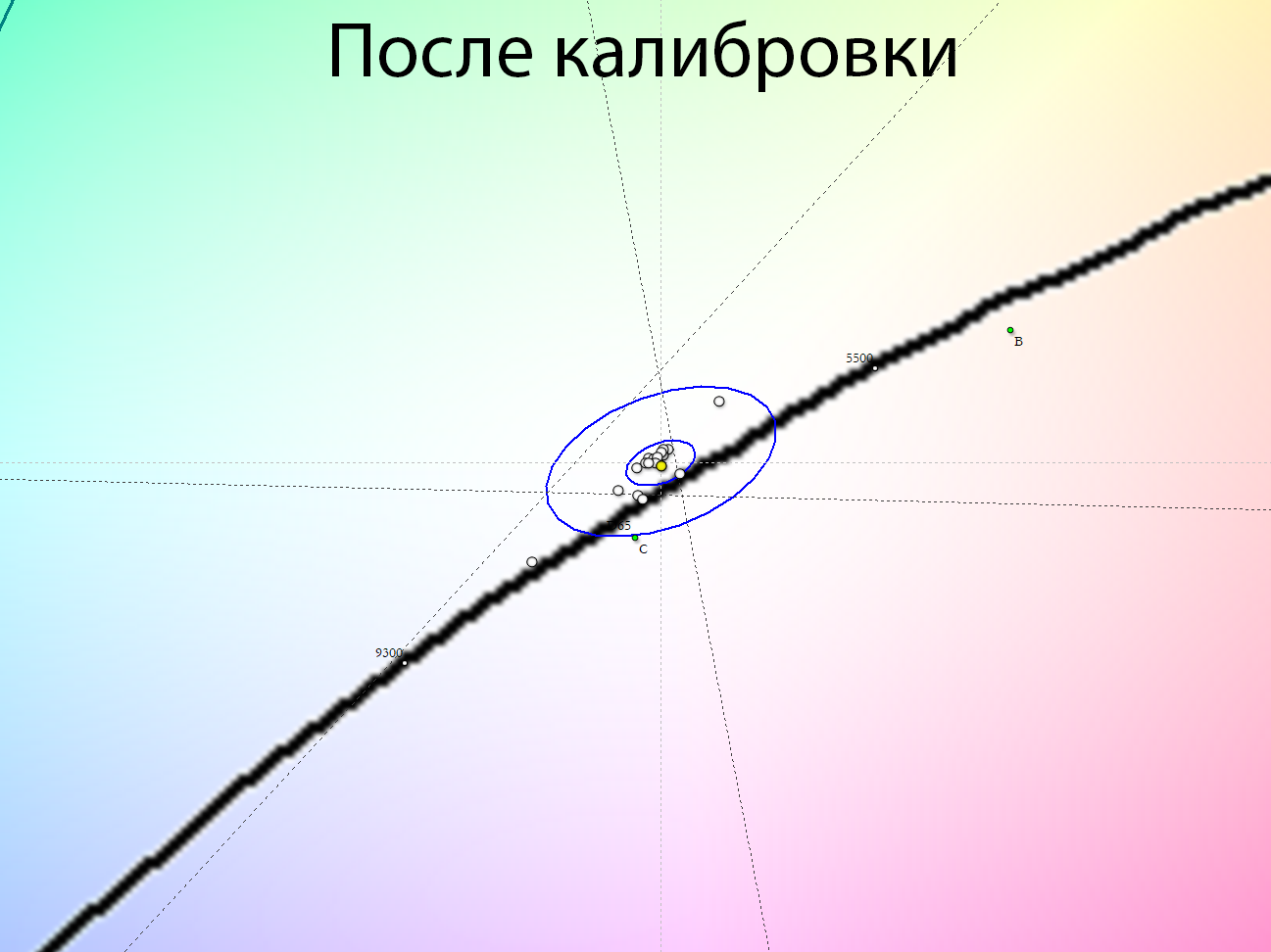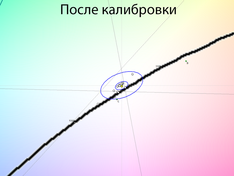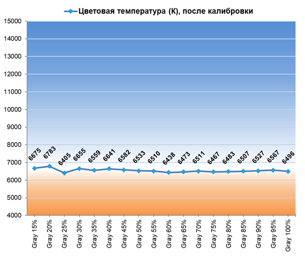 После настройки и калибровки точка белого и все точки серого клина пришли в норму, баланс изображения стал нейтральным — без проявленных паразитных оттенков. Стабильность ЦТ оттенков серого установилась на высоком уровне — как в Filmmaker Mode.