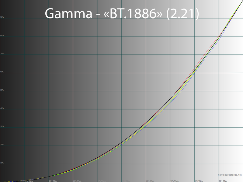 Для быстрой настройки, в отсутствие необходимости использовать подключение к ПК, потребитель может воспользоваться двумя доступными режимами «Гамма», быстро корректирующими реальный контраст изображения. Среди доступных режимов по умолчанию выбран «Гамма 2,2», в дополнение к нему есть уже отмеченный BT.1886, всё чаще встречающийся в качестве референса для настройки ТВ. В случае с новинкой Xiaomi он показал себя гораздо лучше по точности, чем установка гаммы 2,2, наиболее точно приближаясь к ней. В обоих случаях использовались настройки ЦТ на уровне 6500 К для исключения дисбаланса между цветовыми каналами.