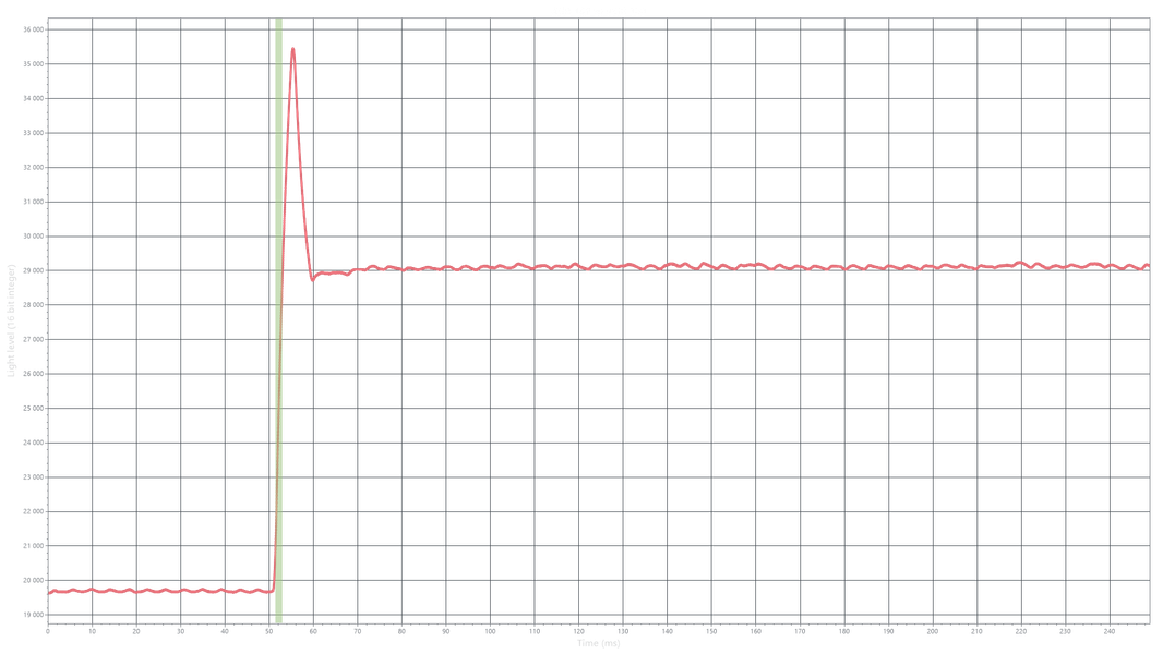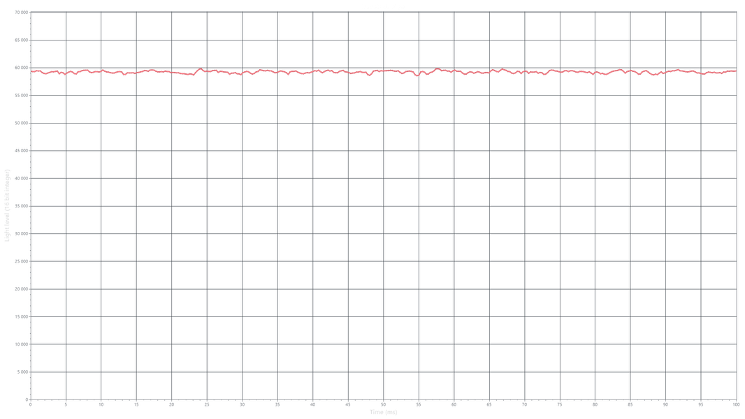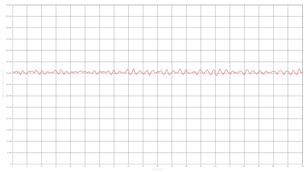 На любом уровне яркости видимое мерцание отсутствует, его не выявляет и тест на стробоскопический эффект. Регистрация зависимости яркости от времени при различных уровнях яркости выявила модуляцию яркости с очень высоким коэффициентом заполнения, что и объясняет отсутствие полноценного мерцания.