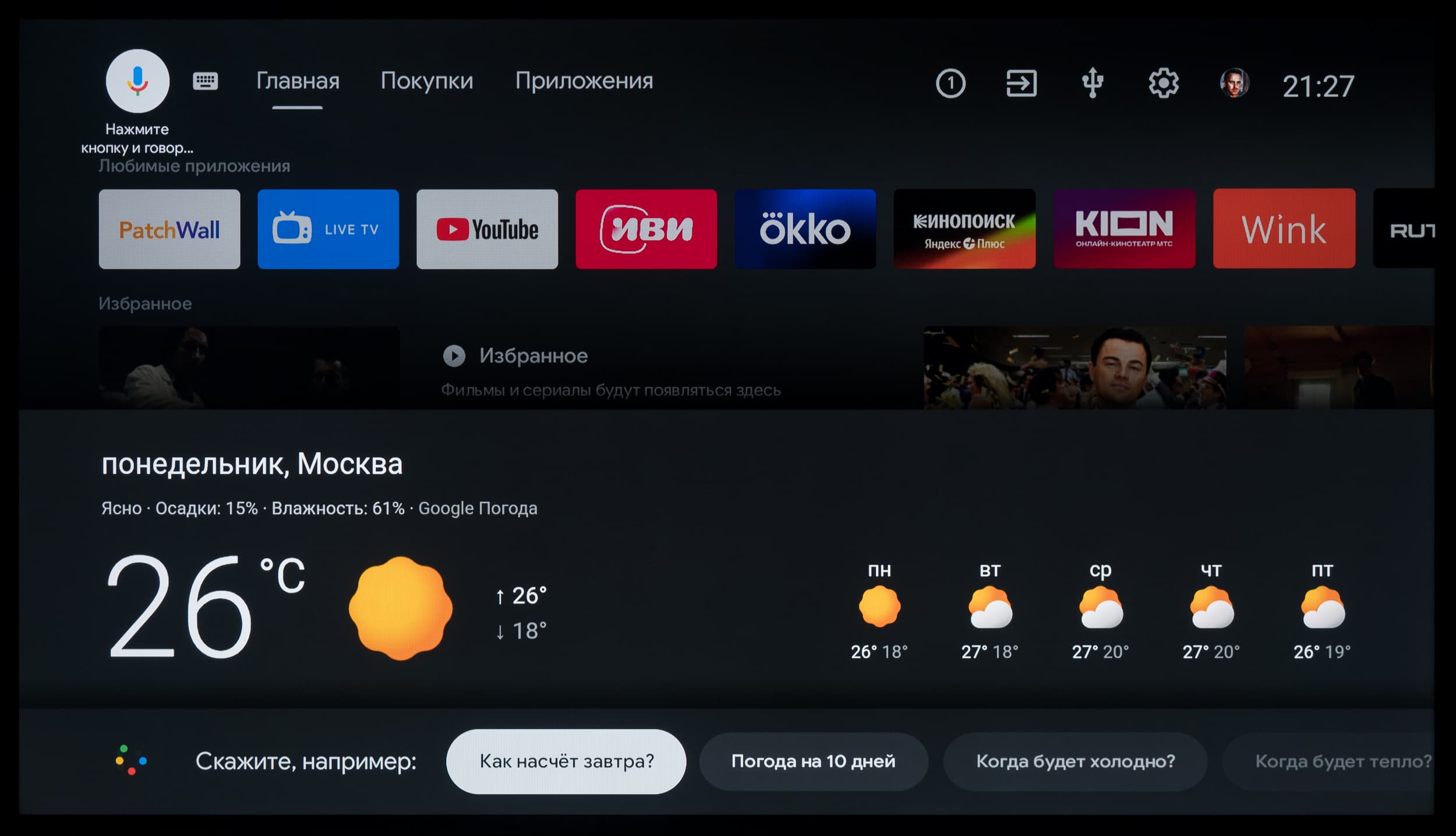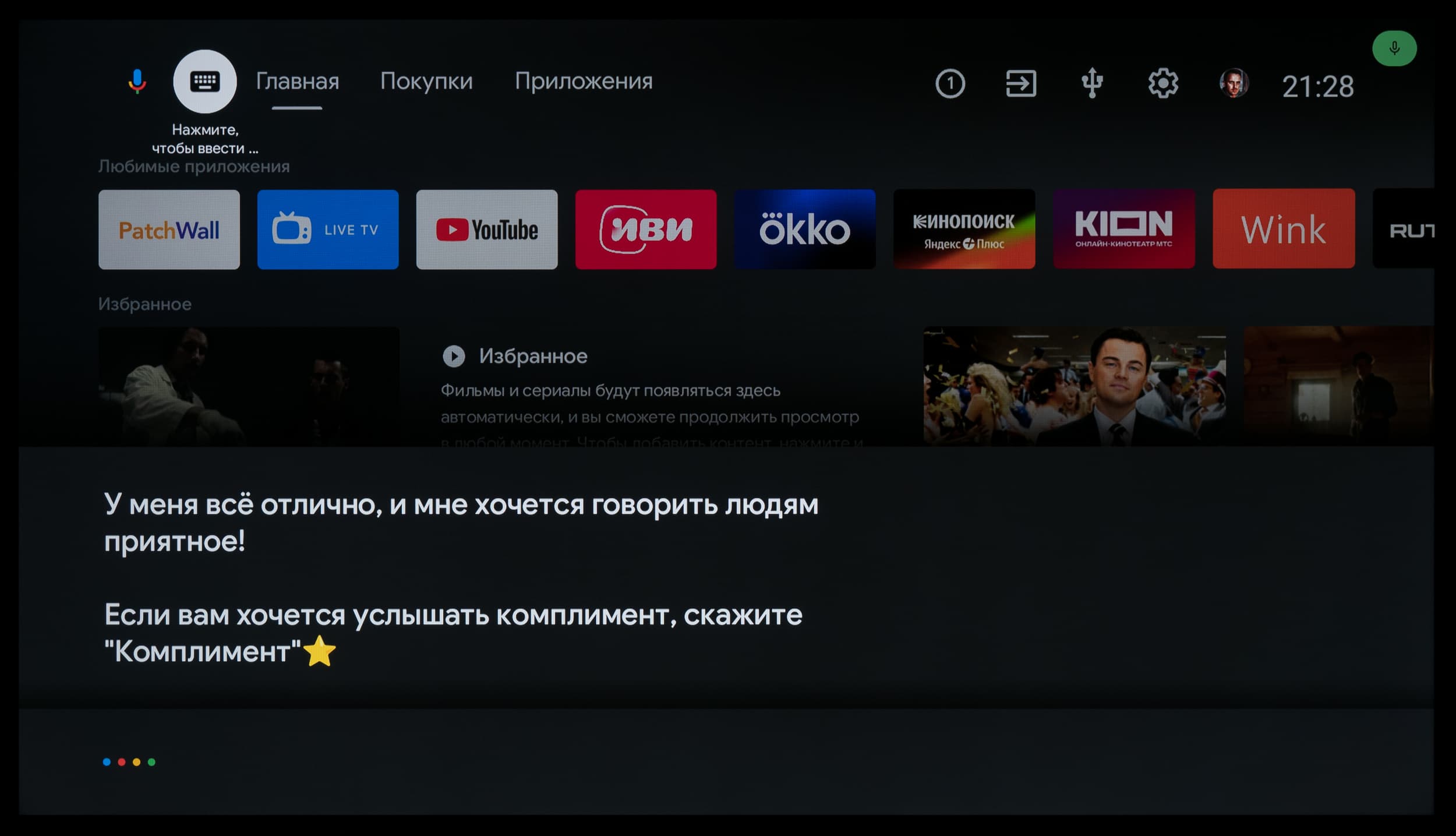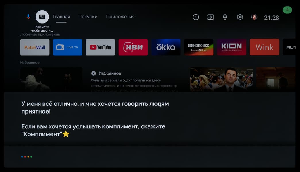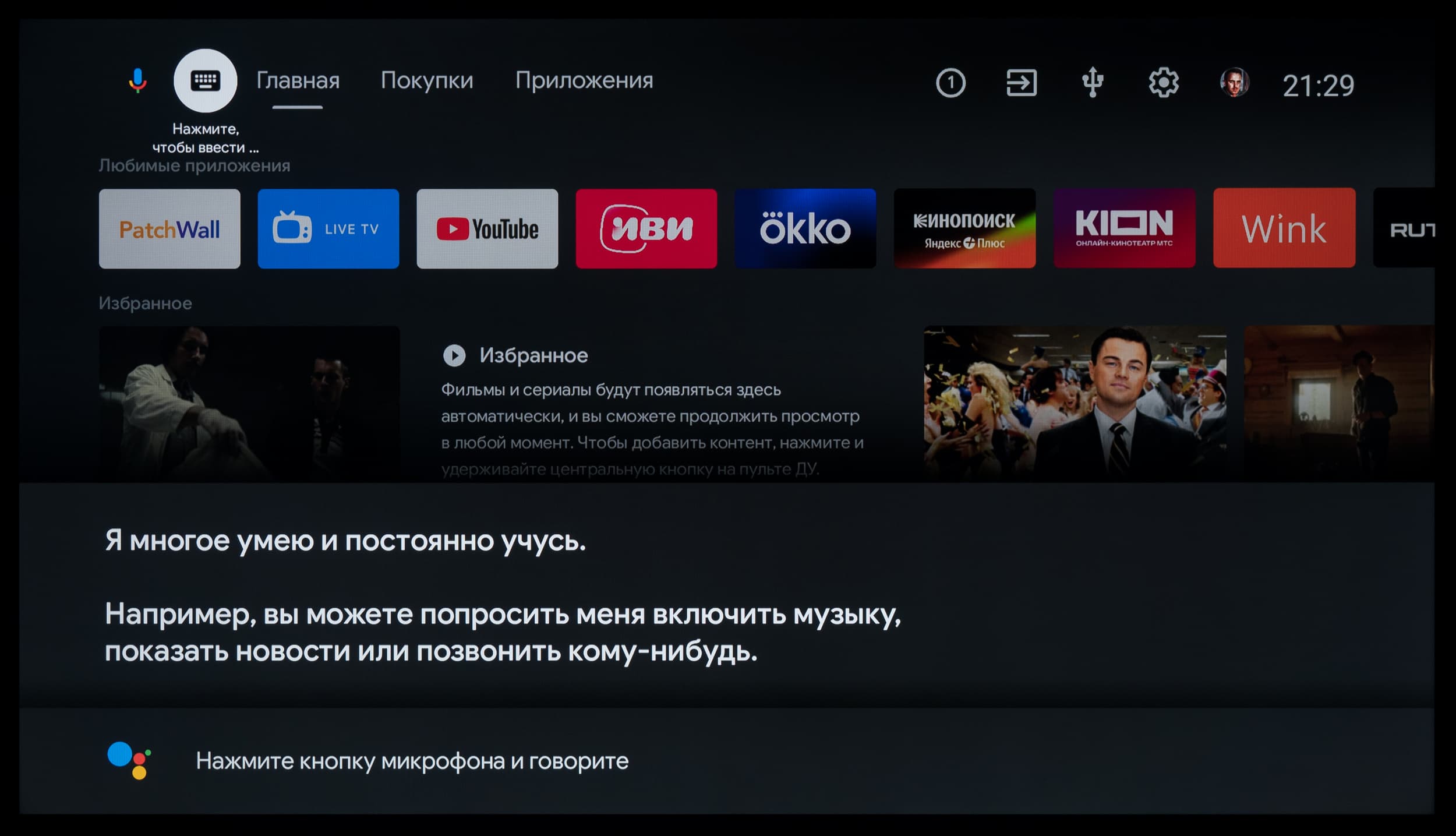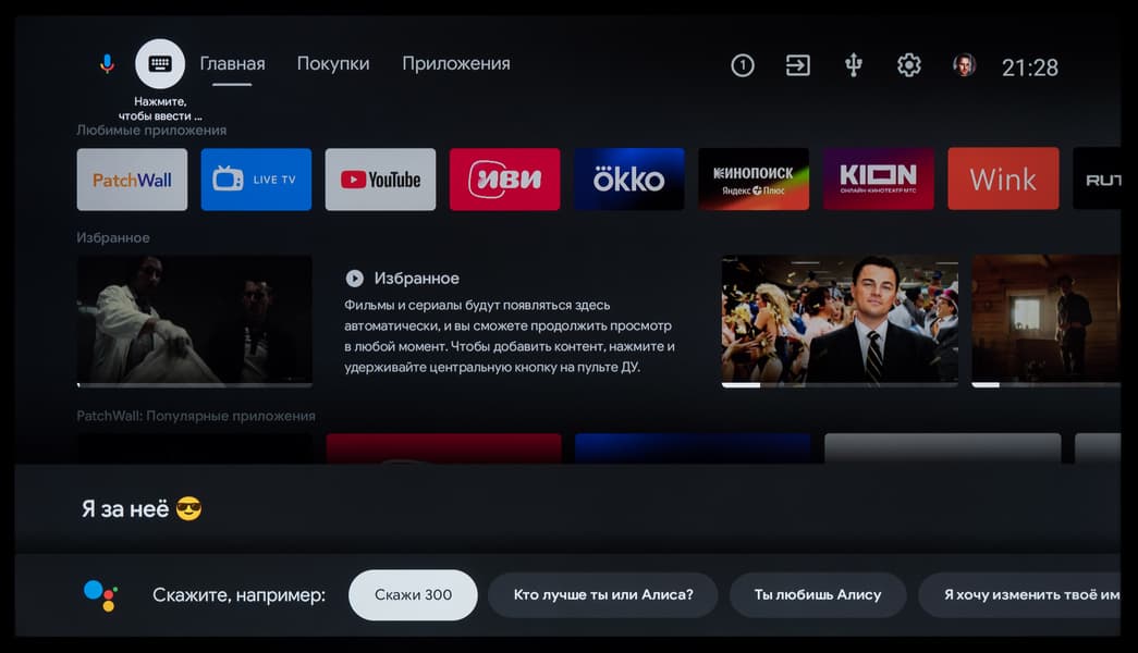 В ряде программ работает голосовой ввод текста. Также есть базовая интеграция с самим ТВ: например, голосом можно менять громкость, выключать/включать звук, открывать меню с настройками, выбирать нужный вход и запускать программу по ее названию (но лишь если вы правильно ее назовете, без излишнего акцента).