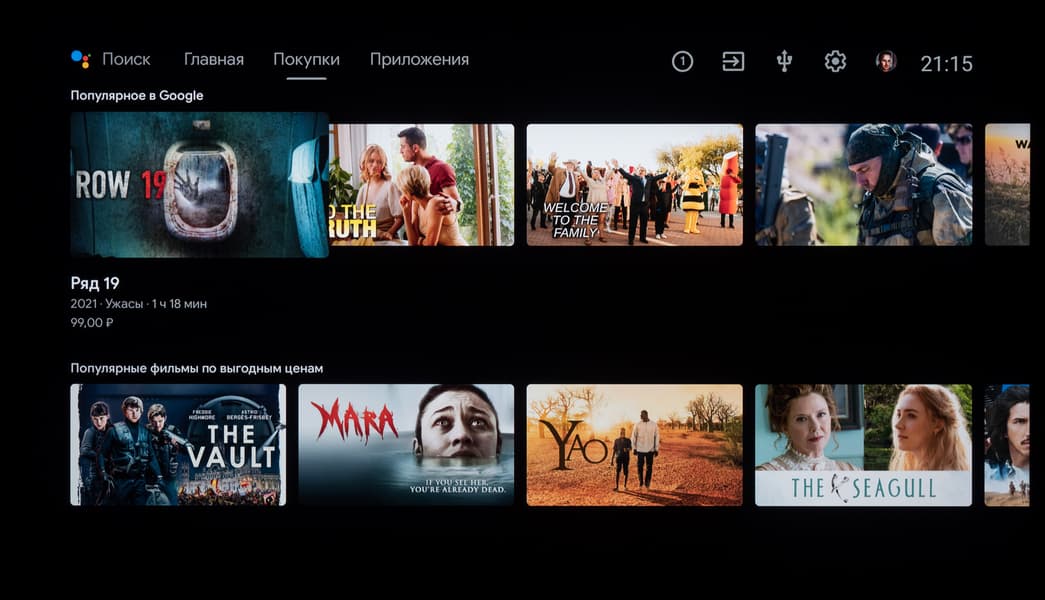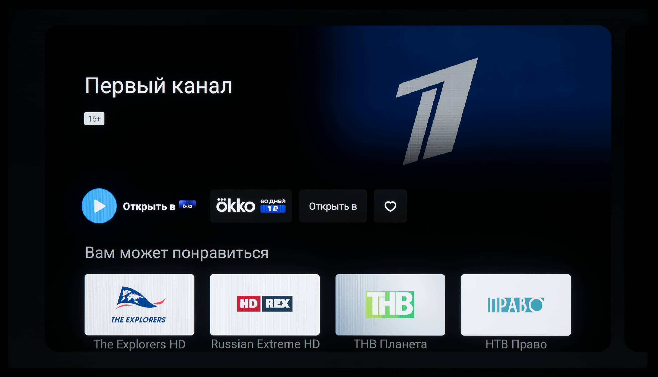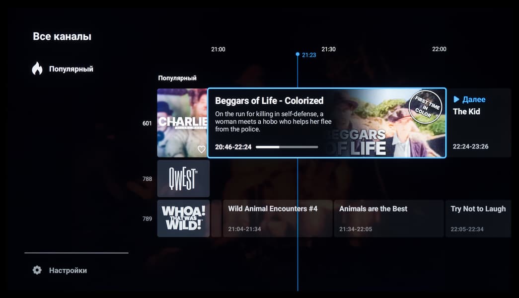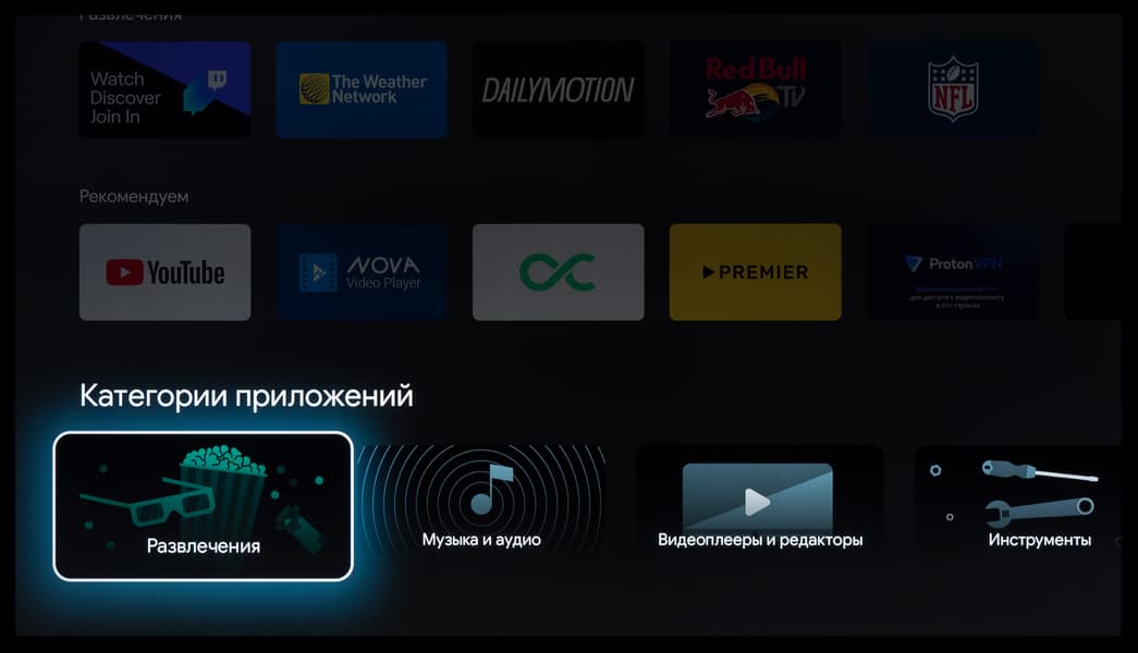 Итак, главный экран представляет собой несколько горизонтальных лент с плитками избранных установленных приложений, избранного контента и рекомендуемого контента, предоставляемого различными программами, в том числе с разбивкой на каналы. Надписи слева над лентами поясняют, к чему относится содержимое лент. Никаких дополнительных блоков Xiaomi и особых настроек мы не увидели — это чистый современный Android TV.