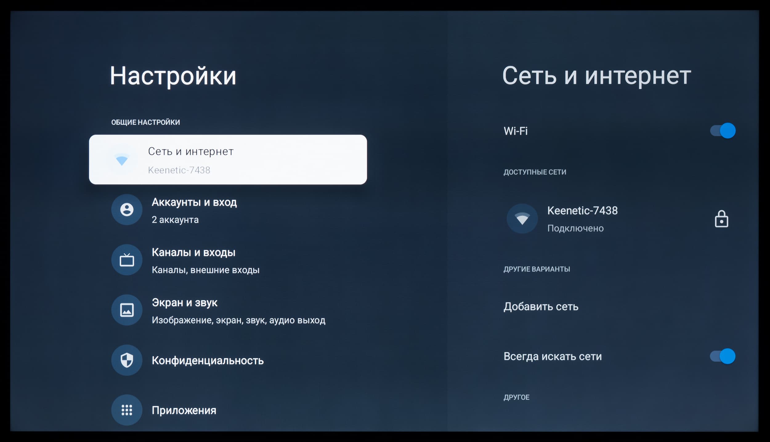 Первоначальную настройку системы можно провести с помощью входа в свой Google-аккаунт прямо с телефона, что позволяет сэкономить львиную долю времени. Главный экран Android TV многим хорошо знаком, а в версии c Android 14 он еще сильнее стал напоминать Google TV, особенно если пройтись дальше — по блокам с настройкой. Удивительно: унификация есть в «полный рост», а оболочек всё еще две...