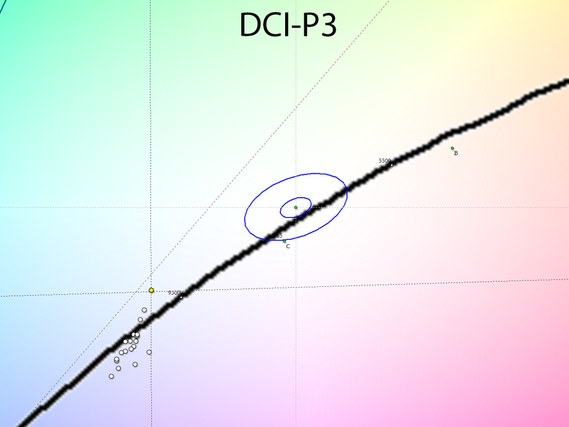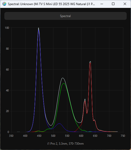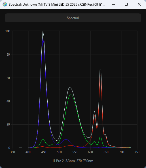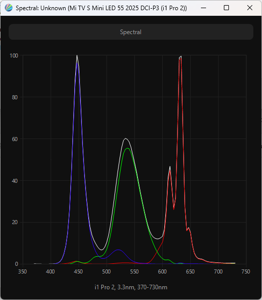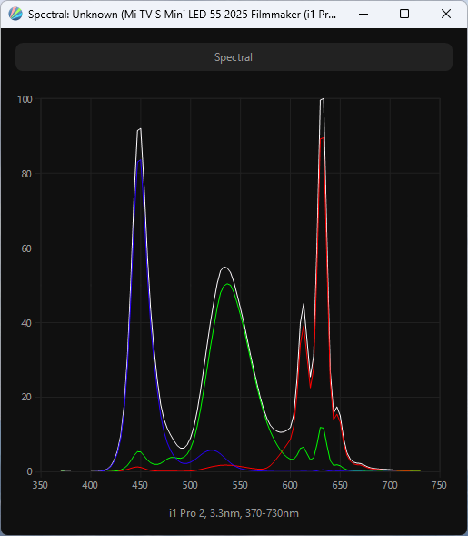 При активации одного из режимов эмуляции (в случае выше — sRGB) и отдельного режима Filmmaker происходит подмешивание компонент для сужения цветового охвата, а разница в спектрах свидетельствует о разной настройке цветовой температуры между режимами. В случае же настройки установки цветового пространства DCI-P3 спектр максимально соответствует результату заводских установок — Natural.