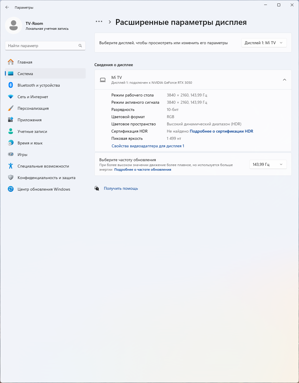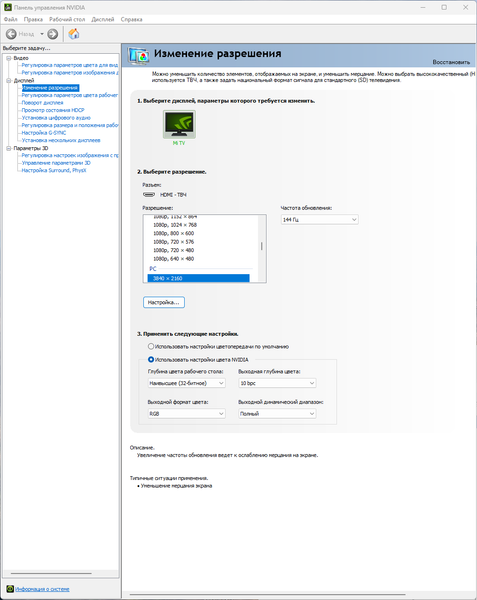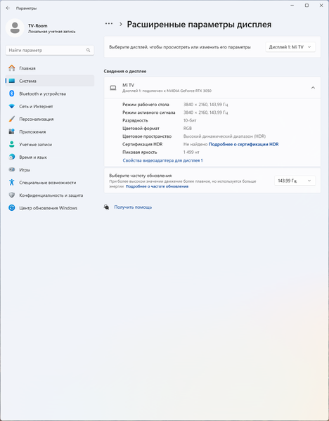 Первый уровень задержки вряд ли будет ощущаться при использовании ТВ в качестве монитора для работы за ПК, но для динамичных игр может быть несколько великоват. А потому телевизор следует переключить в режим c частотой 144 Гц.