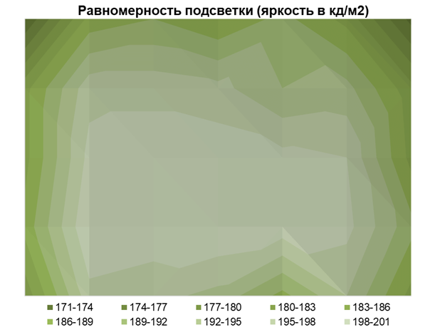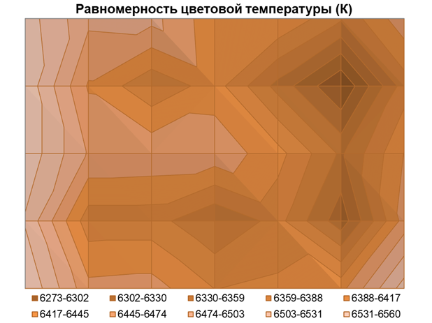 Еще меньше вопросов к равномерности цветовой температуры: среднее отклонение от центральной точки составило всего 0,9%, а максимальное — 3%. Вариация ЦТ оказалась близка к 290 К, что будет сложно заметить в реальном использовании и близко к уровню профессиональных мониторов с гораздо меньшей диагональю.