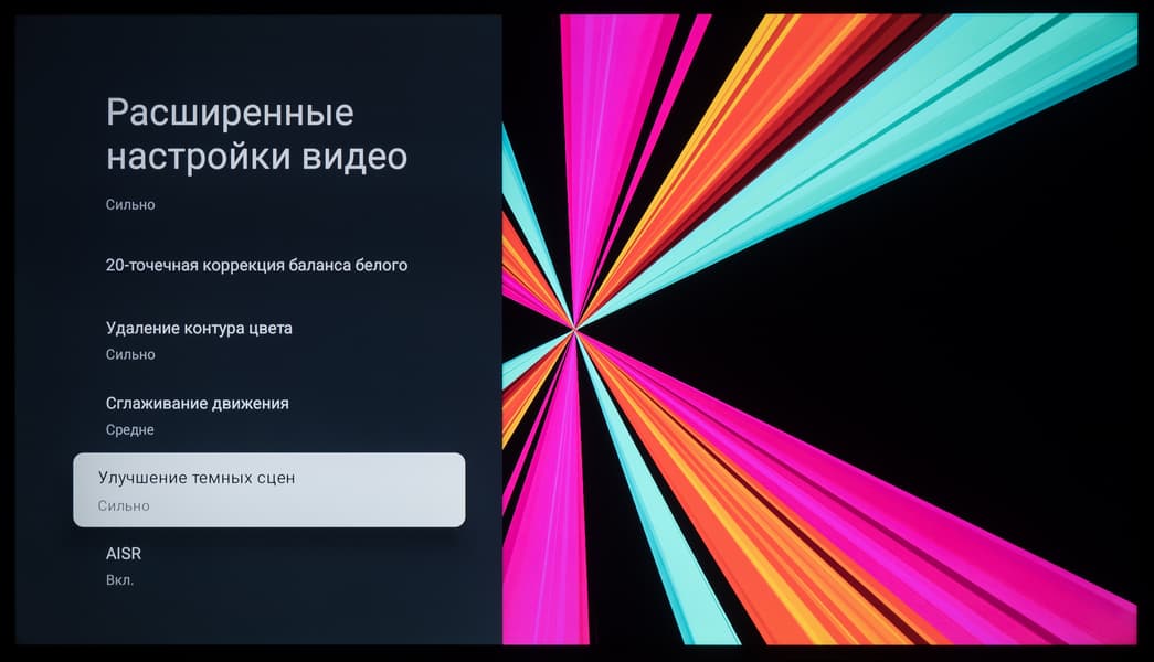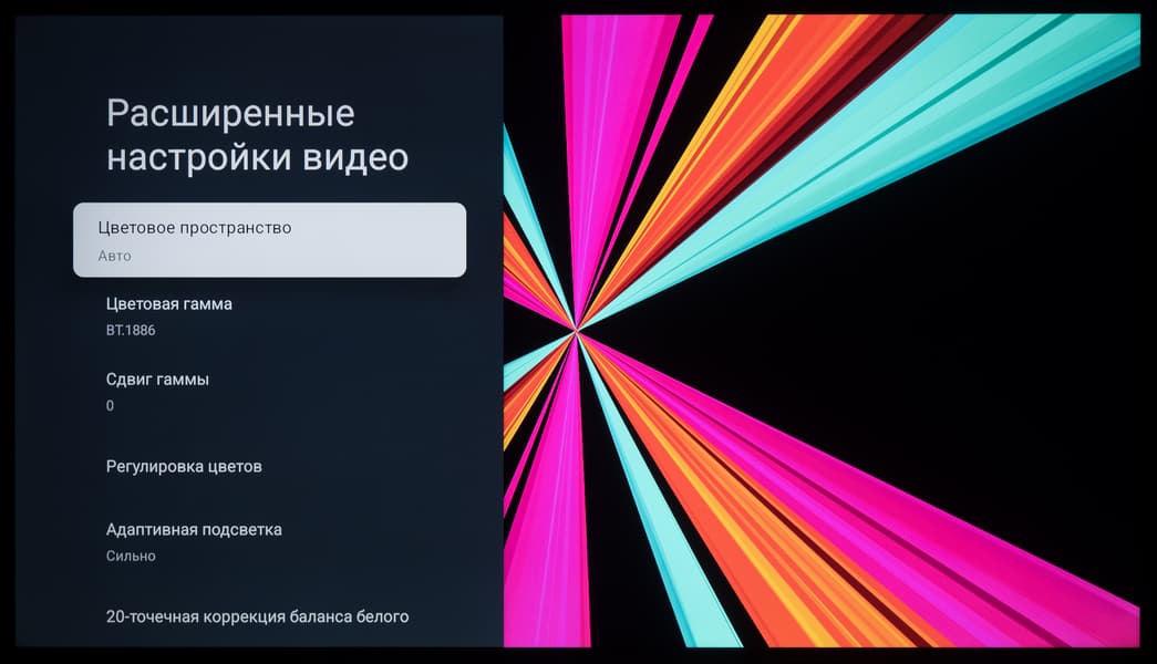 - Базовая настройка цветопередачи в большинстве заводских режимов откровенно «хромает» (особенно полученный цветовой охват) — следует использовать Filmmaker Mode для пространства Rec.709 и отдельно настраивать/калибровать телевизор для просмотра контента в расширенном цветовом диапазоне