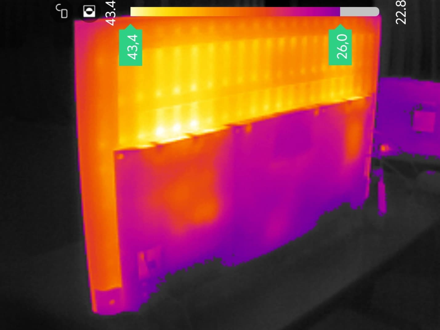 В задней части корпуса наибольший нагрев был локализован сверху — в области без пластикового кожуха. Становится понятна причина повышенного нагрева одного из участков матрицы, ведь именно за ним расположен встроенный блок питания. Диапазон температуры сзади — от 26 до 43 градусов.