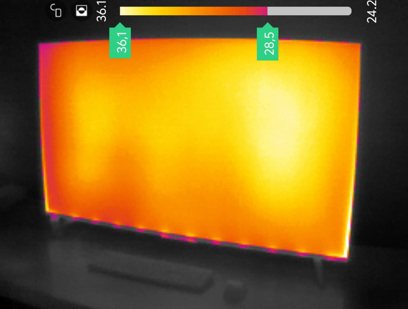 На передней поверхности диапазон температуры составил от 28,5 до 36,1 градусов с локализацией самых теплых участков в верхней правой стороне экрана и по краям снизу. Также выражены точечные участки по нижней грани, свидетельствующие, скорее всего, о небольших «утечках» подсветки в этих местах.