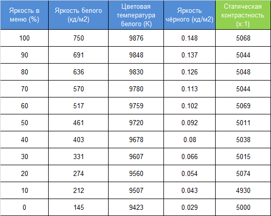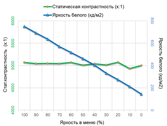 Максимальный коэффициент статичной контрастности в случае новинки стремится к 5100:1 в идеальных условиях без работы системы локального затемнения. В ходе же тестирования стандартного режима работы среднее значение подобралось к 5050:1 против заявленных производителем 6500:1 — терпимо, но хотелось бы повыше. После калибровки со значительными правками RGB-сигнала для приведения точки белого в норму (6500 К) коэффициент контрастности составил 4680:1.