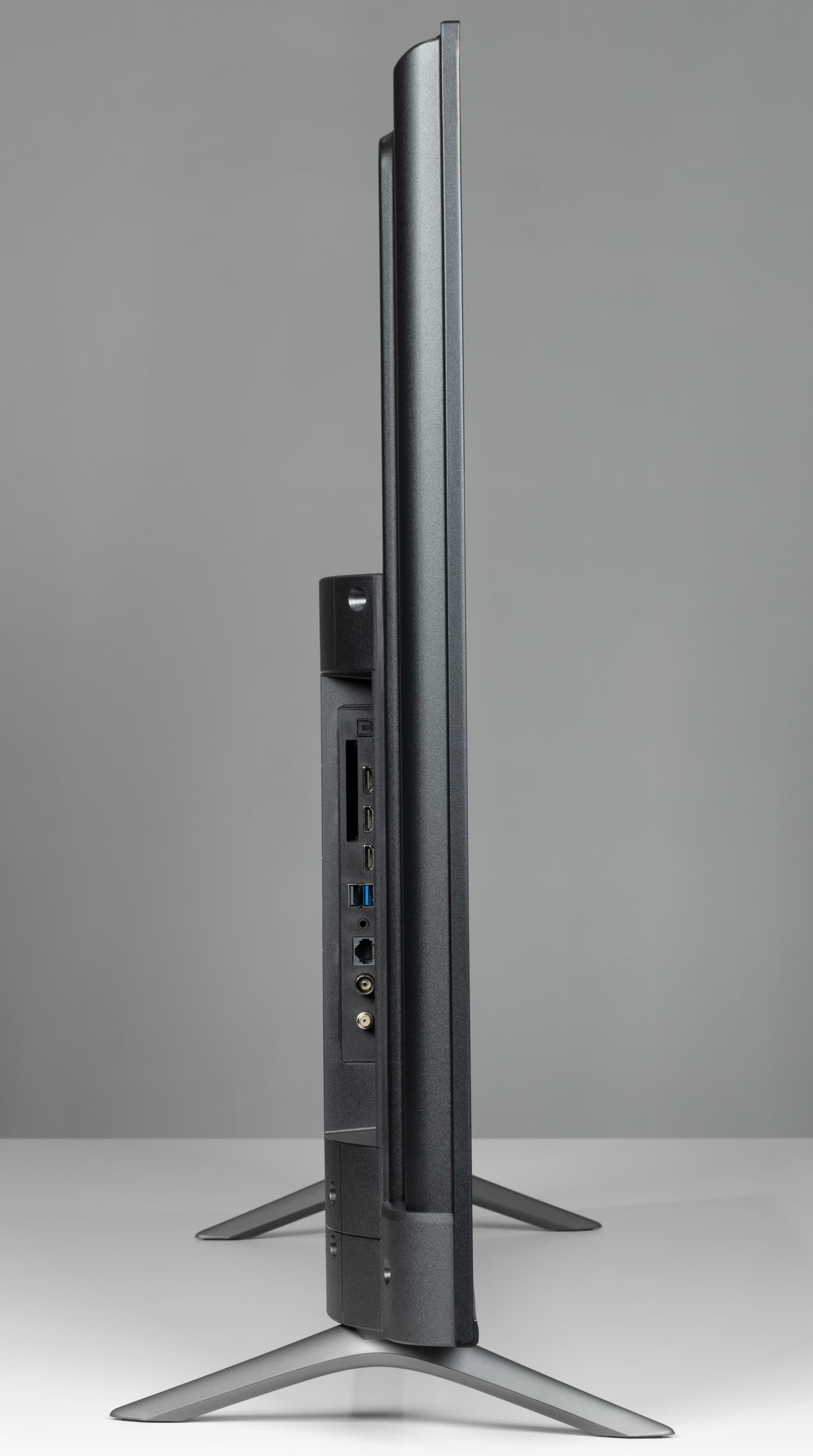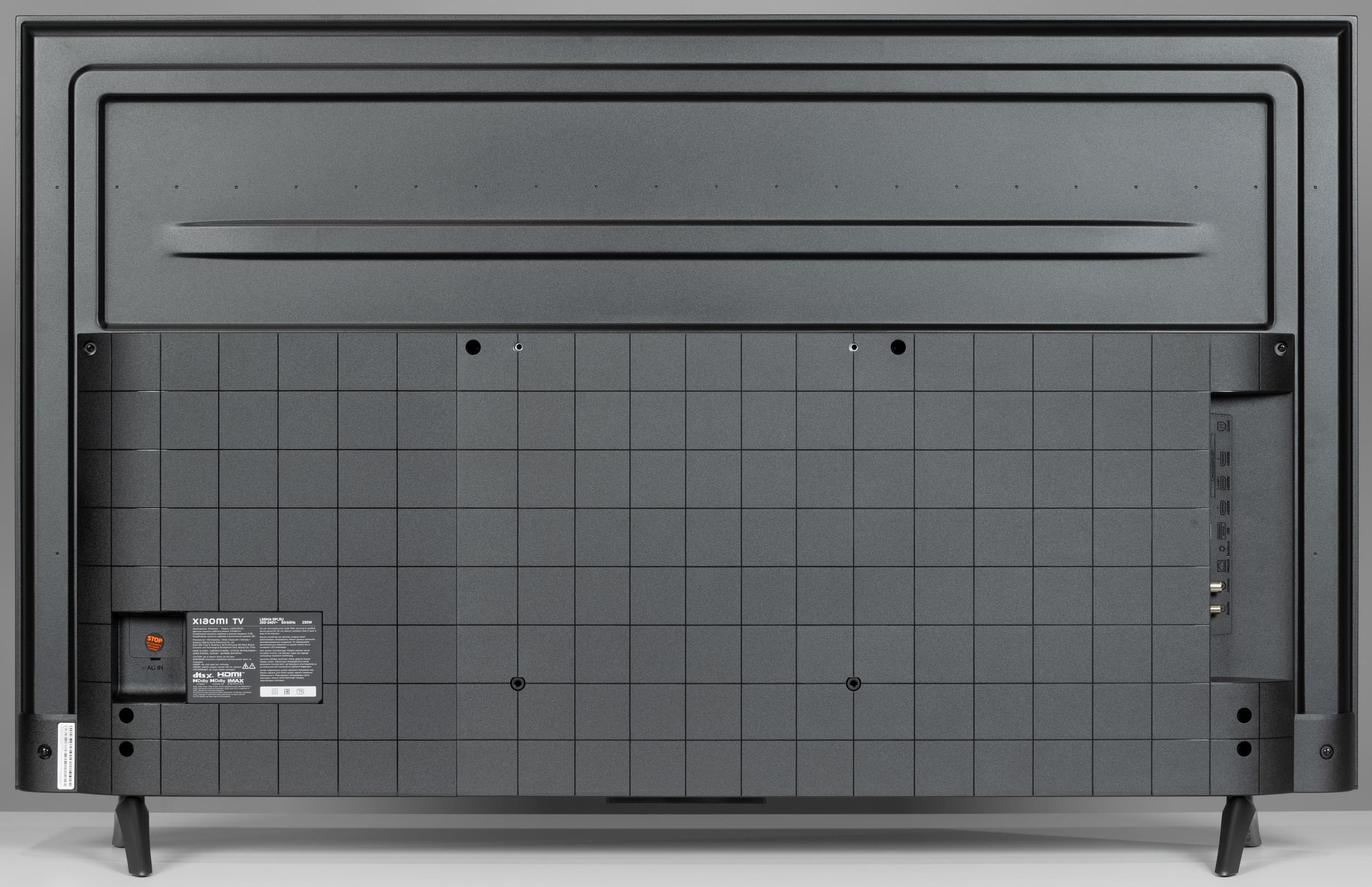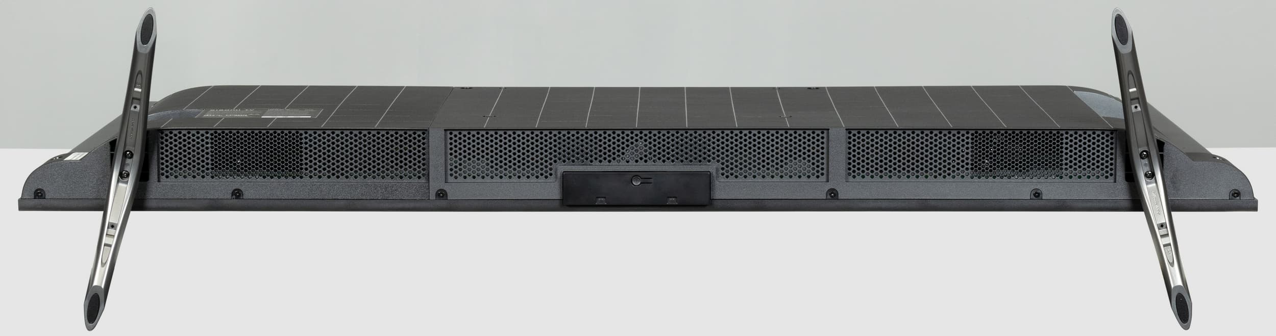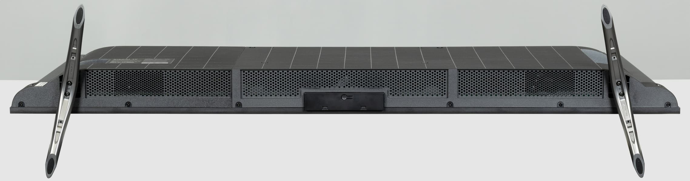 Сзади телевизор выглядит очень аккуратно. Задняя панель в верхней части изготовлена из тонкого листа стали и имеет стойкое черное матовое покрытие. Сверху и с боков панель заходит на торцы и образует окантовку экрана.