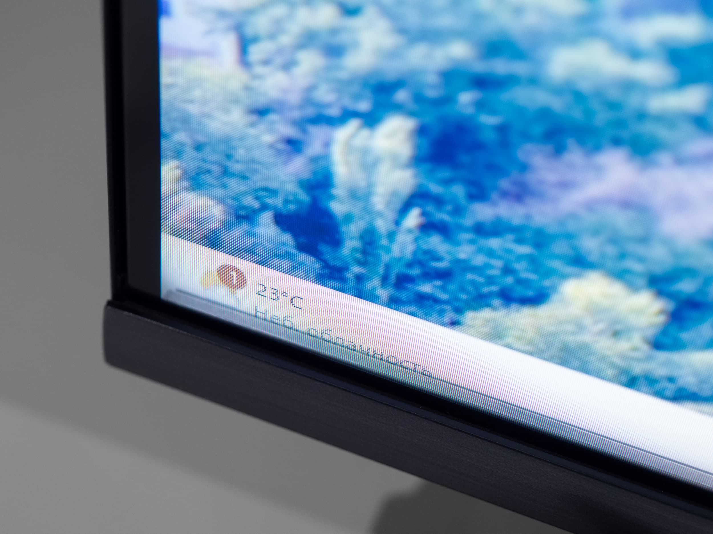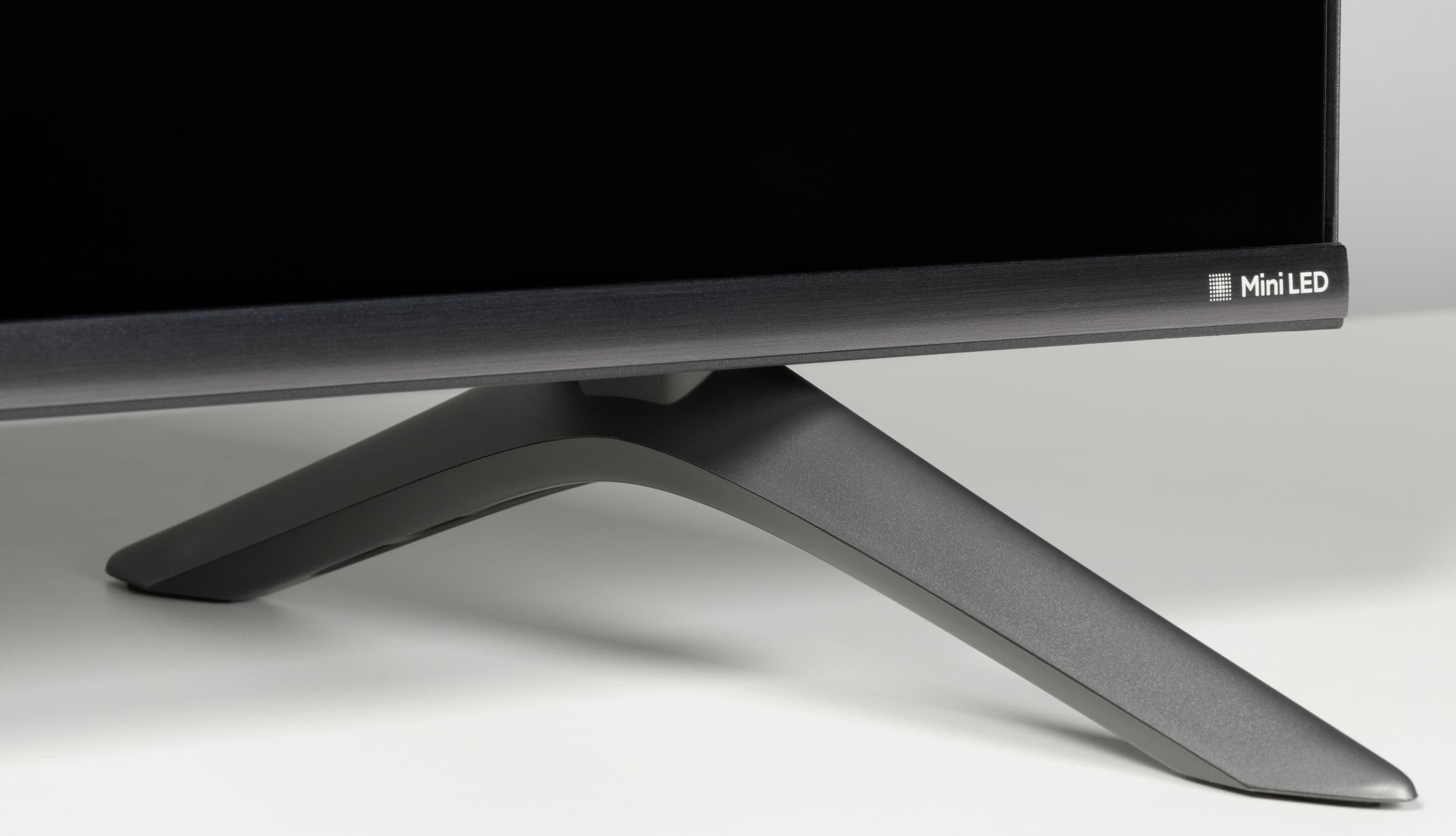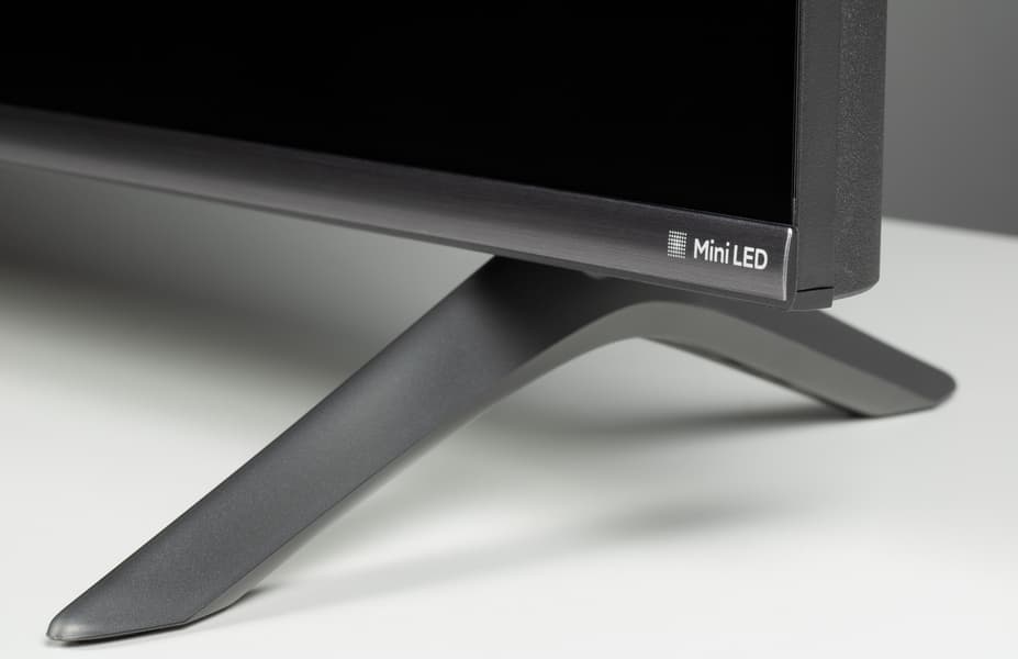 В нижней же части используется достаточно узкая накладка с логотипом бренда по центру и указанием на использование подсветки QD-Mini-LED в правой части.