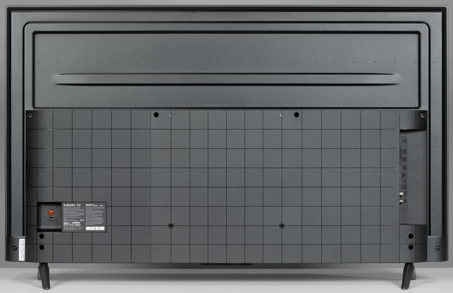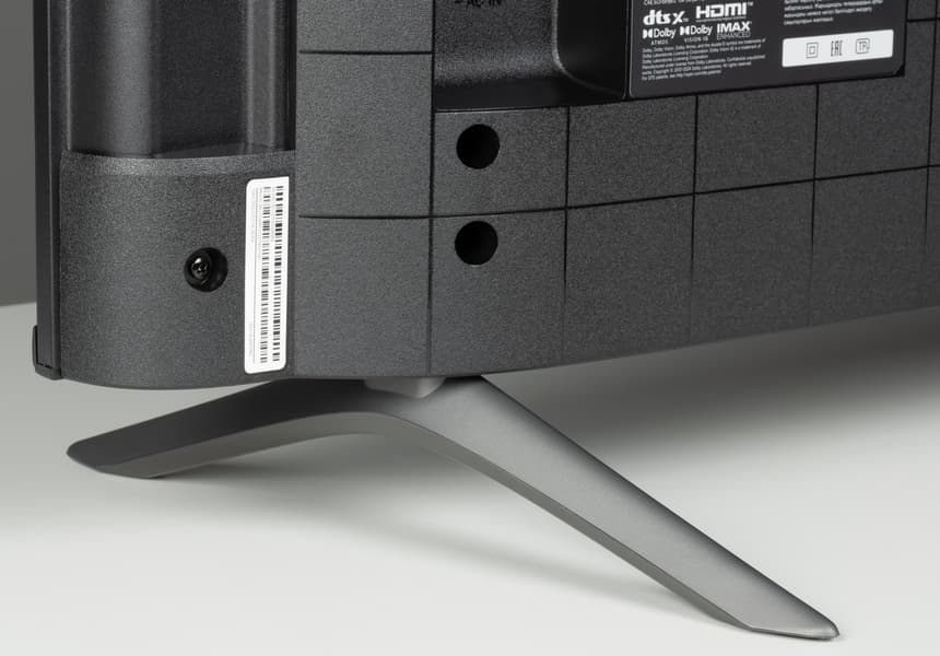 Штатная подставка телевизора Xiaomi состоит из двух относительно компактных пластиковых ножек, покрашенных порошковой краской в темно-серый цвет и прикрепляемых по краям нижней части корпуса устройства.