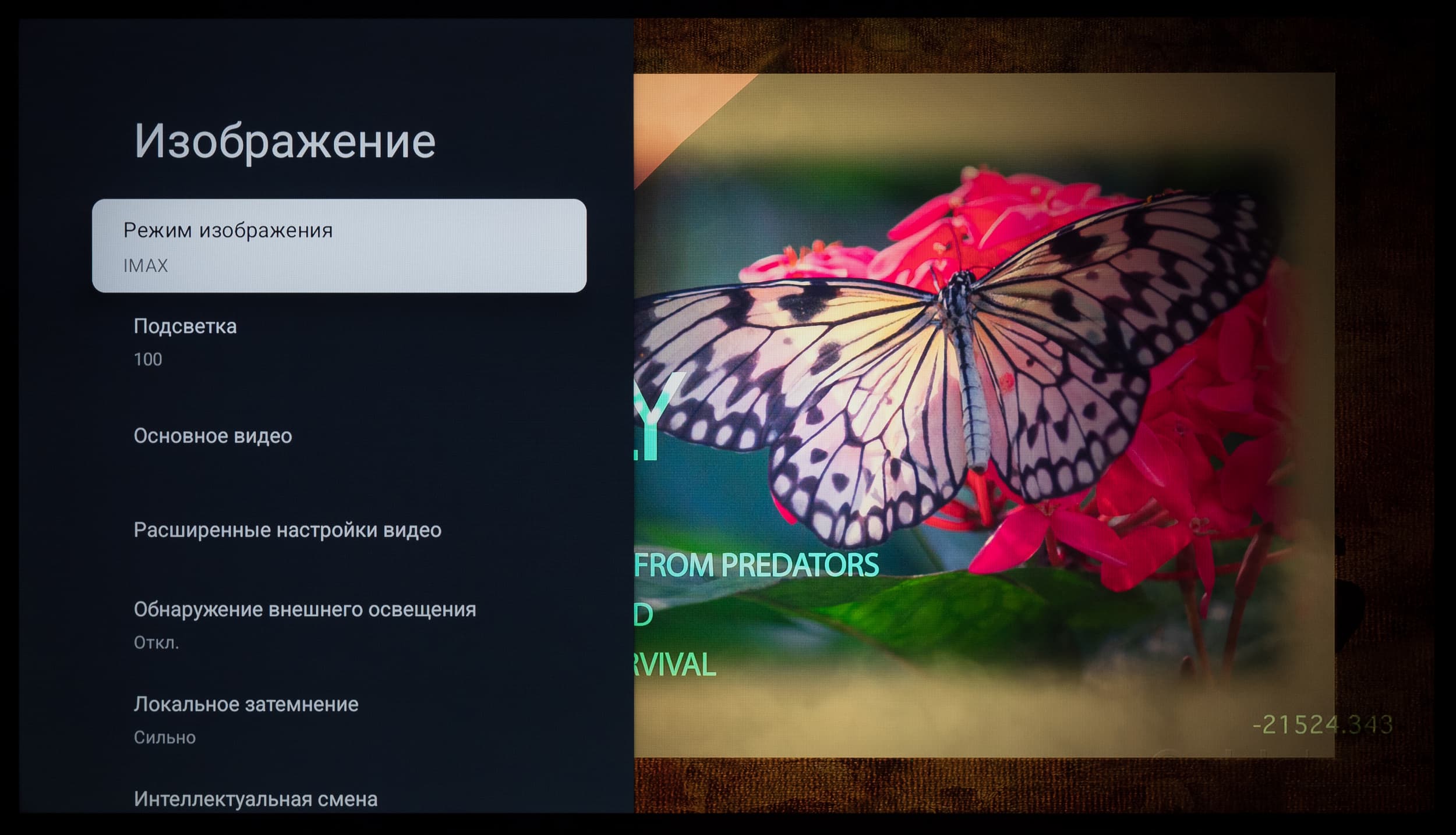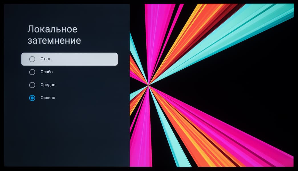При включении функции локального затемнения ситуация на черном сильно преображается. В качестве примеров выше представлены фотографии черного поля с расстояния около 1,5 метров, при выключенной системе локального затемнения, так и с ней в позиции «Сильно» (максимальный уровень воздействия). Видно, что при активации системы большая часть экрана просто отключается, а подсвечиваются лишь зоны с надписями. Делается это очень мягко, без явных яркостных засветок периферии.