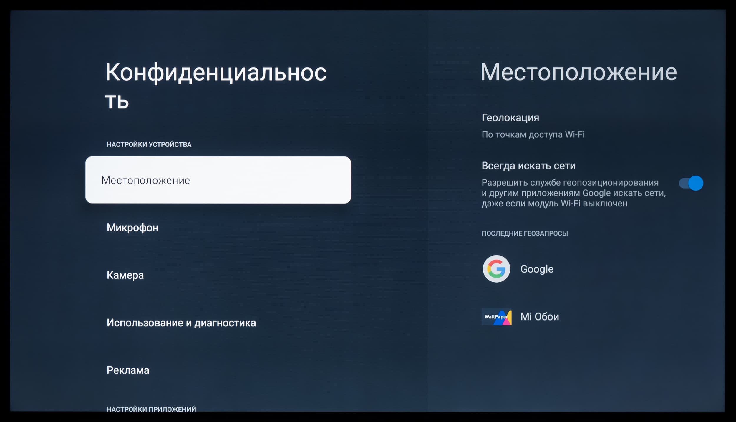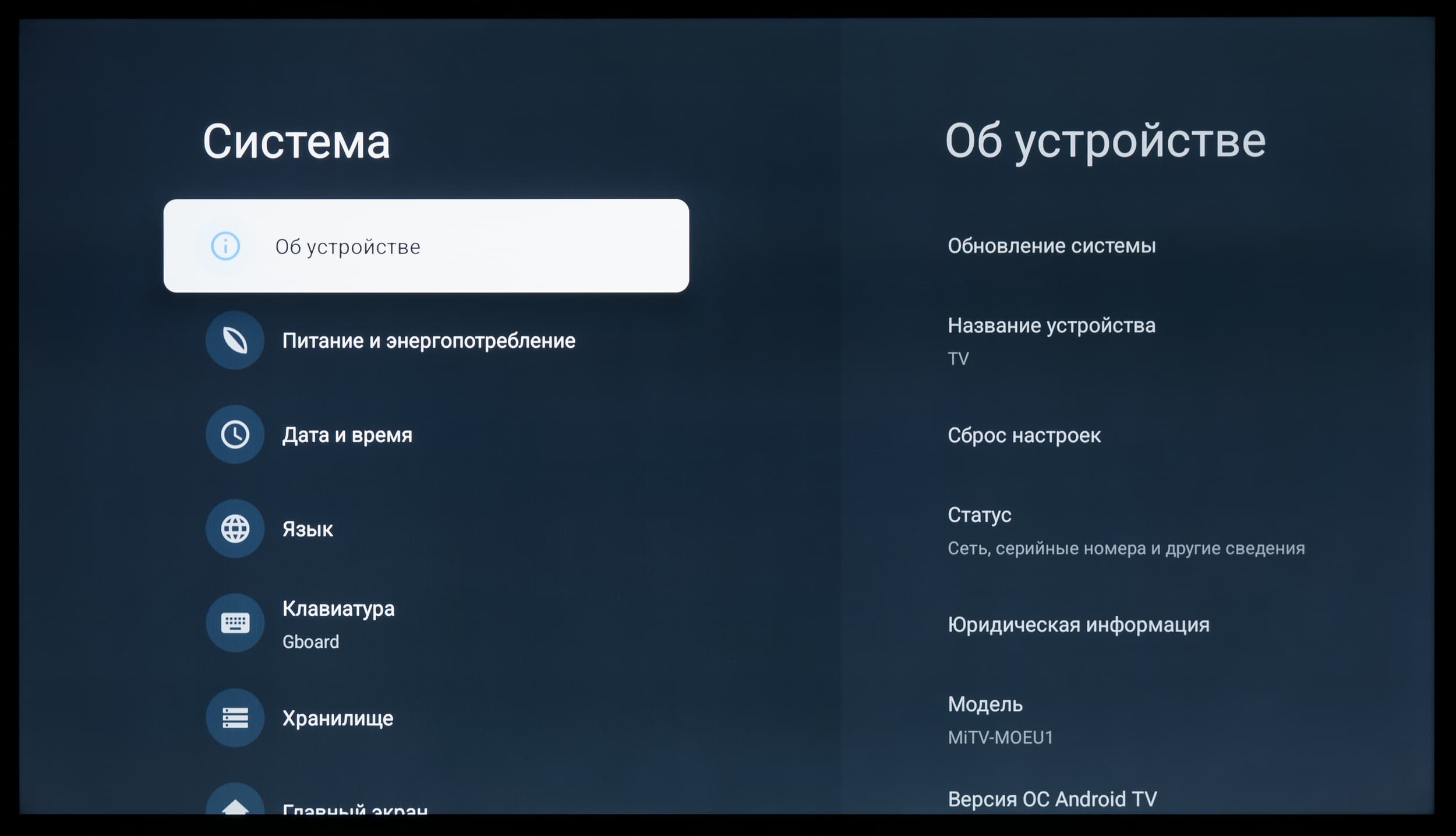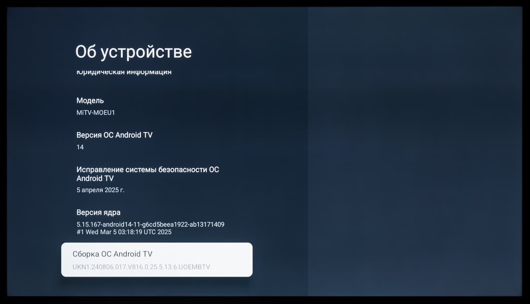 Рассматриваемый телевизор Xiaomi работает под управлением платформы Android TV в данном случае основанной на Android версии 14 — последняя доступная для телевизоров с ОС Google. Перед началом тестирования телевизор был обновлен до последней версии прошивки. Отдельно отметим, что в версии ТВ без РСТ/EAC вероятно установлена собственная оболочка/ОС Xiaomi — Hyper OS 2 c несколько отличающейся функциональностью.