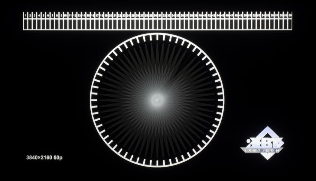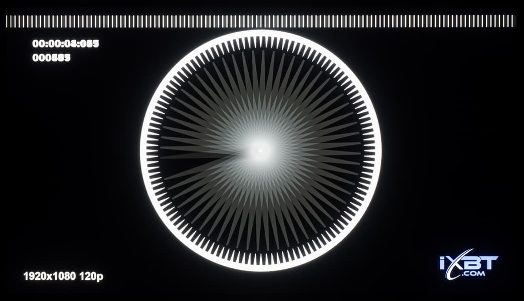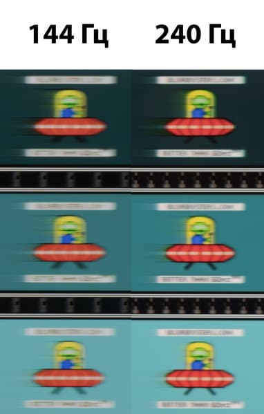 Для наглядного представления о том, что на практике означает такая скорость матрицы и какие могут быть артефакты от разгона, приведен снимок выше, полученный с помощью движущейся камеры. Подобные снимки показывают, что видит человек, если он следит глазами за двигающимся на экране объектом. Видно, что при прочих равных условиях плавность изображения при 240 Гц повышается, но длина шлейфов сохраняется примерно на том же уровне. Всё ожидаемо: выше изначальных возможностей используемой VA-панели не прыгнуть.