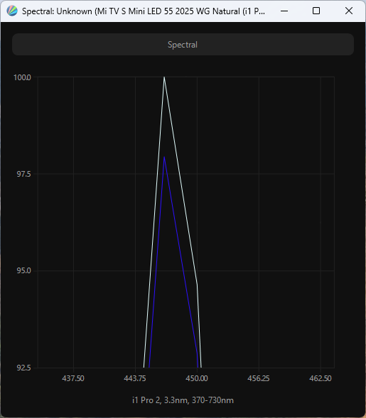 Виден сдвинутый пик синего, приходящийся на 446-448 нм, что формально обеспечивает снижение нагрузки на глаза, но на соответствие последним сертификатам безопасности претендовать не может.