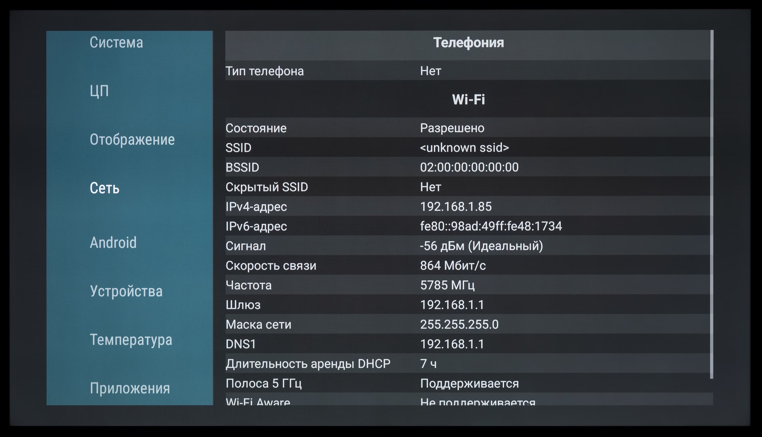 В развернутой сети 5 ГГц на базе роутера Keenetic Hopper (KN-3810), при нахождении телевизора в 5 метрах по прямой от него с преградой в виде монолитной стены, телевизор Xiaomi продемонстрировал стабильную скорость подключения 750—864 Мбит/c (тип подключения — 11ac/k/r/v, 2×2 80 МГц). Это очень высокий результат.