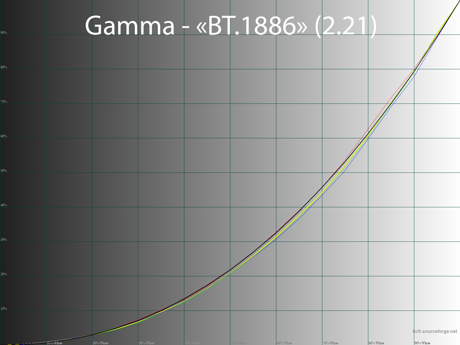 Первые три режима продолжают демонстрировать схожие результаты и на гамма-кривых. Среднее значение в каждом из них оказалось на уровне 2,07. Различимость глубоких теней присутствует, но есть сильнейший дисбаланс RGB, а также небольшая потеря градаций в верхнем диапазоне. В свою очередь Filmmaker использует встроенную гамму с функцией BT.1886 и продемонстрировал гораздо лучшие результаты: тени есть, но без излишеств, баланс RGB практически не нарушен, среднее значение гамма — 2,21.