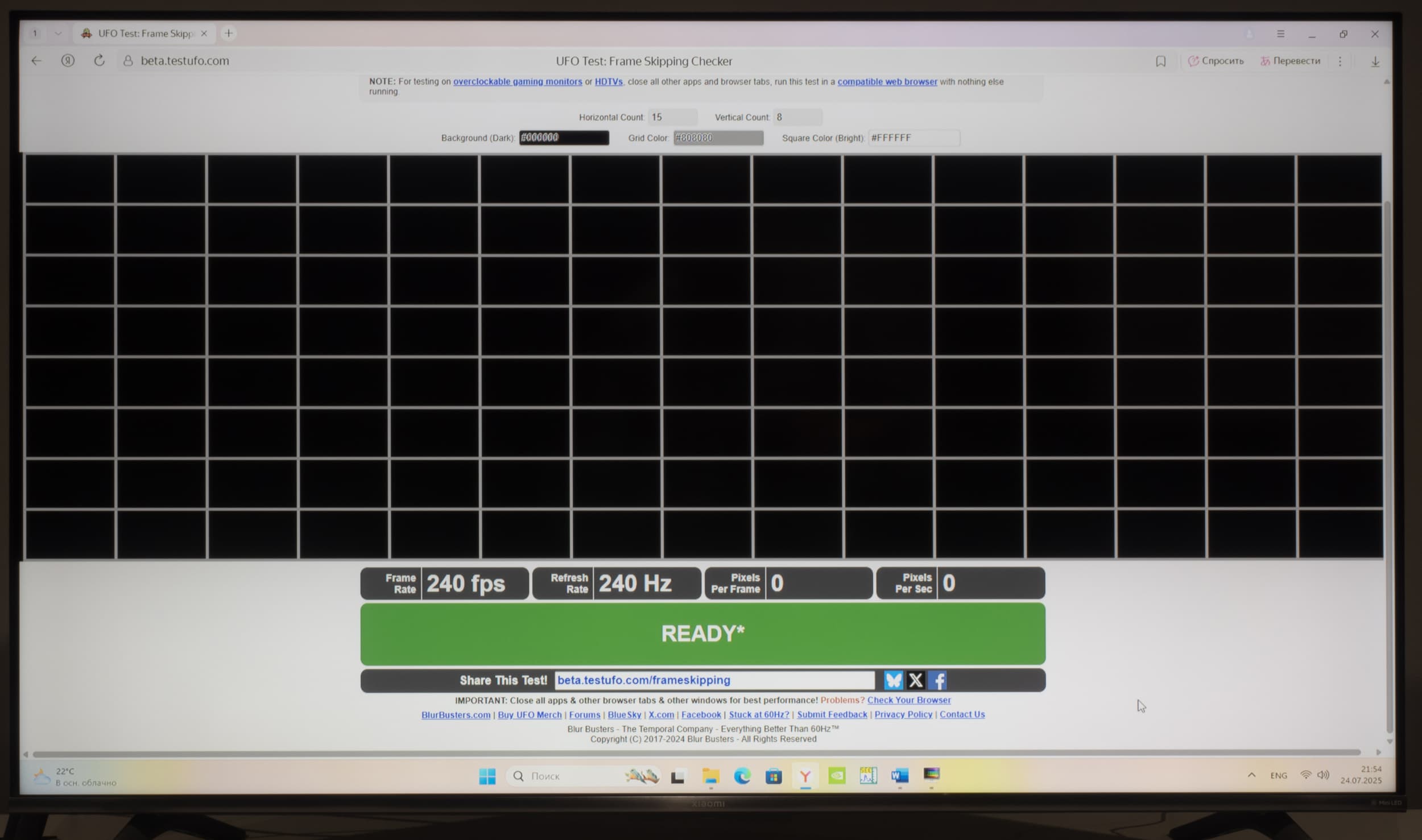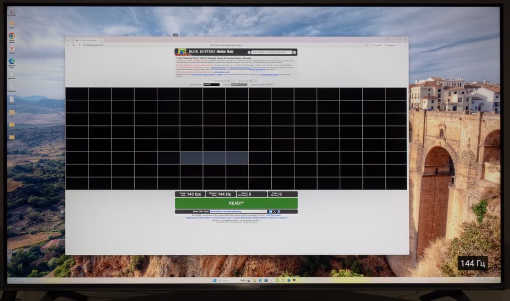 При установке частоты обновления 144 Гц в режиме 4K пропуск кадров на телевизоре Xiaomi не выявлен — проверено специальным тестом Blur Busters (TestUFO). Нет его и в режиме DLG с частотой 240 Гц — пропуск отсутствует.