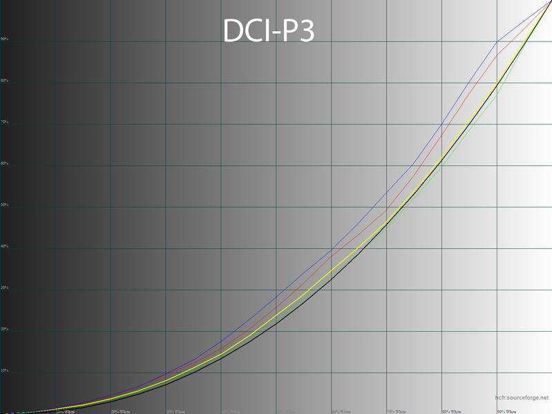 К нашему большому удивлению, цветовой охват при настройках по умолчанию составил всего 114,5% покрытия пространства sRGB и 80,4% DCI-P3. Цвета на экране отличаются адекватной, достаточно нейтральной насыщенностью. При переходе к DCI-P3 охват расширяется до 125,6% цветового объема sRGB и 88,1% соответствия DCI-P3. Так уже лучше.