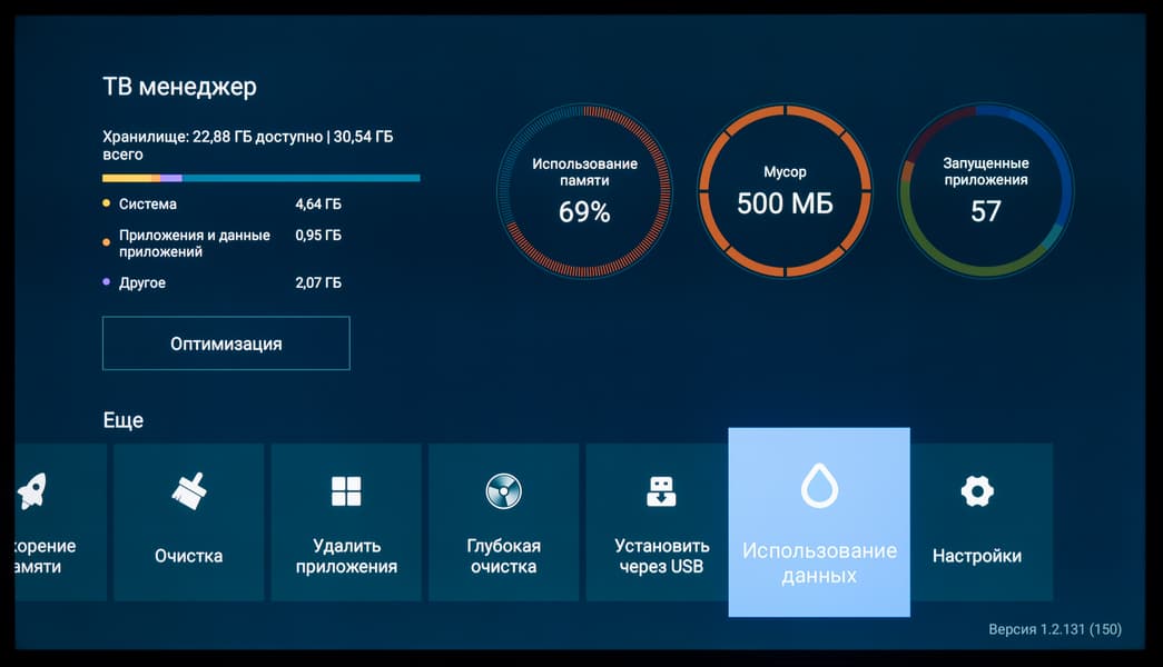 Встроенная электронная инструкция у телевизора отсутствует, но есть предустановленный «ТВ-менеджер» для быстрой оптимизации памяти, чистки «мусора», удаления и установки программ (с USB-накопителя), проверки использования данных (памяти).