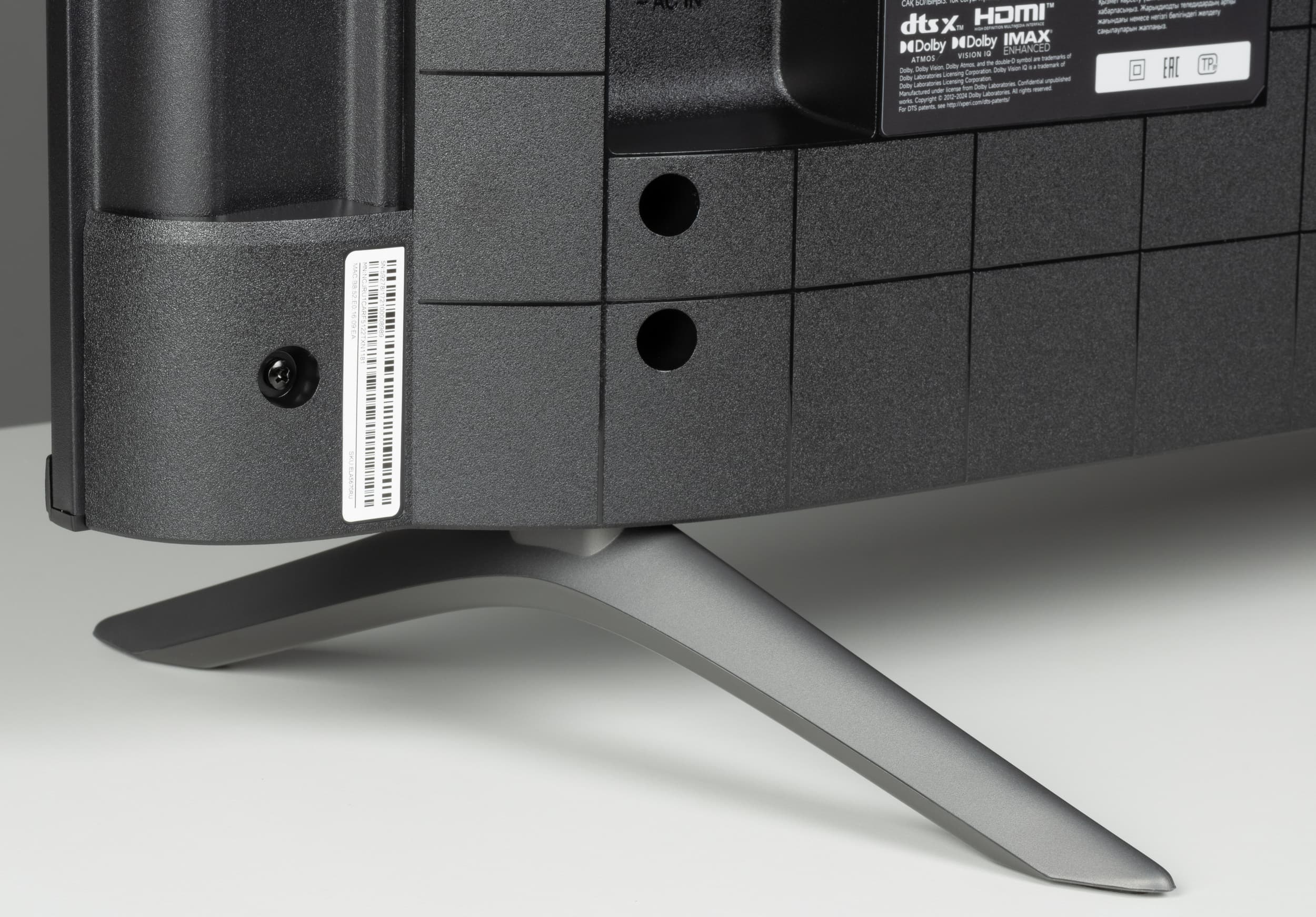 Подставка надежно удерживает крупный корпус ТВ с еле заметным наклоном назад (порядка одного градуса), без лишних содроганий. Другими словами, жесткость собранной конструкции достаточная.