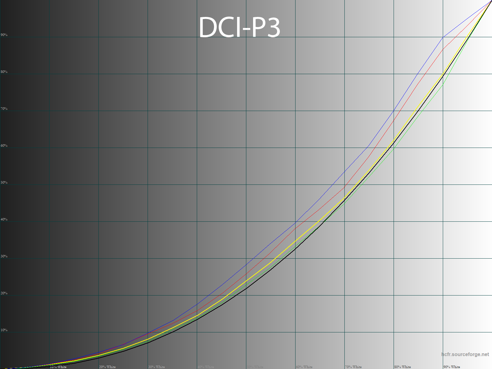 Ниже приведен спектр для белого поля (белая линия), наложенный на спектры красного, зеленого и синего полей (линии соответствующих цветов) для режима экрана Natural с полной цветовой гаммой: