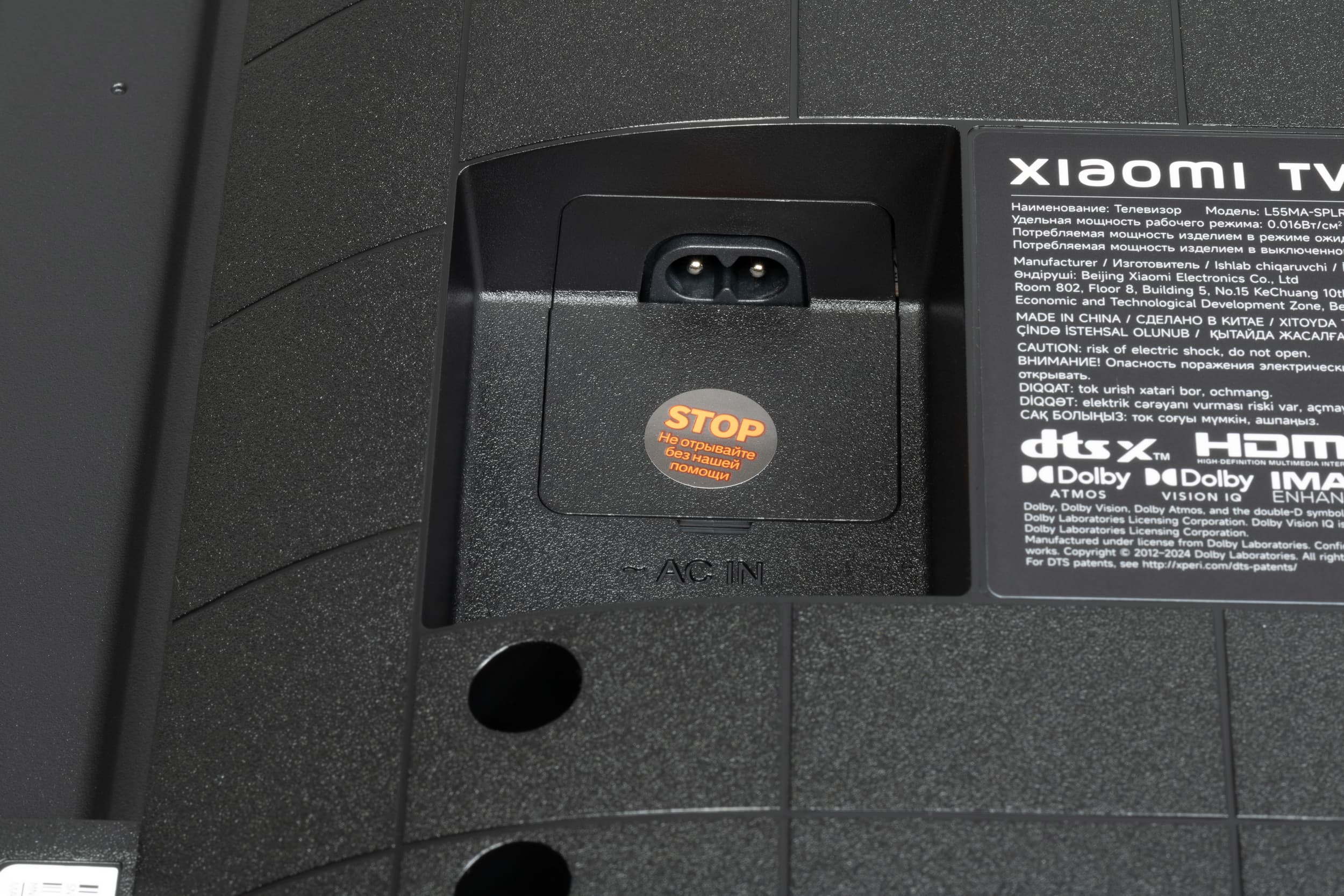 Кабель питания отсоединяемый, его длина 1,8 м. Разъем питания находится отдельно от всех остальных. Здесь же есть наклейка с предупреждением о том, что вскрытие должно происходить только в СЦ.