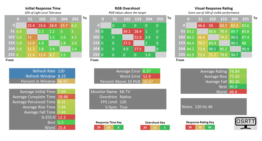 В ходе нашего тестирования фактическое время отклика при переходе черный-белый-черный (BtW-WtB) на частоте обновления 120 Гц составило 12,2 мс (6,2 мс вкл. + 6 мс выкл.). Переходы между полутонами (GtG) происходят в среднем за 7,7 мс. Производителем применен средний «разгон» матрицы, приводящий к несколько заметным артефактам на определенных цветовых переходах. Для *VA-панели в крупном ТВ скорость отклика очень хорошая: в играх картинка не доставит дискомфорта и будет довольно четкой и плавной.