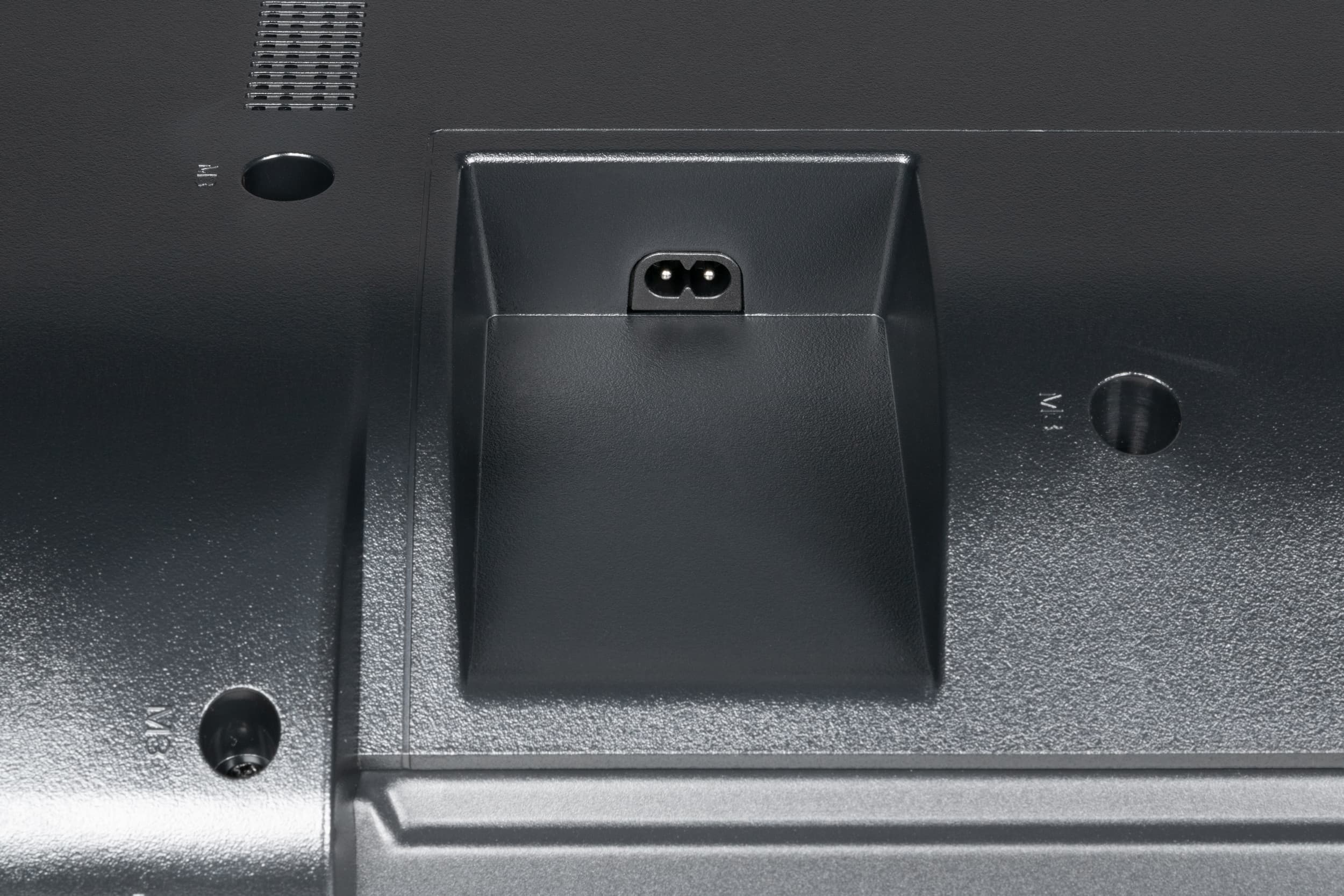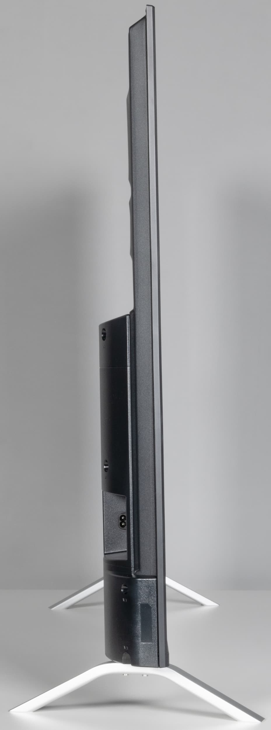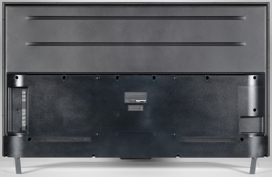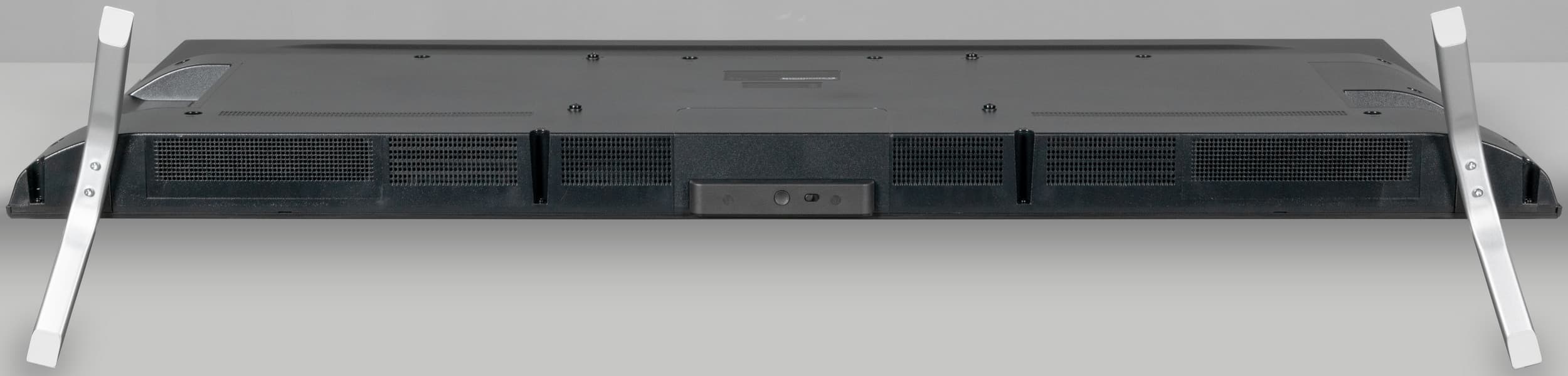 Сзади телевизор выглядит вполне аккуратно. Задняя панель в верхней части изготовлена из тонкого листа стали и имеет стойкое черное матовое покрытие. Сверху и с боков панель заходит на торцы и образует окантовку экрана.