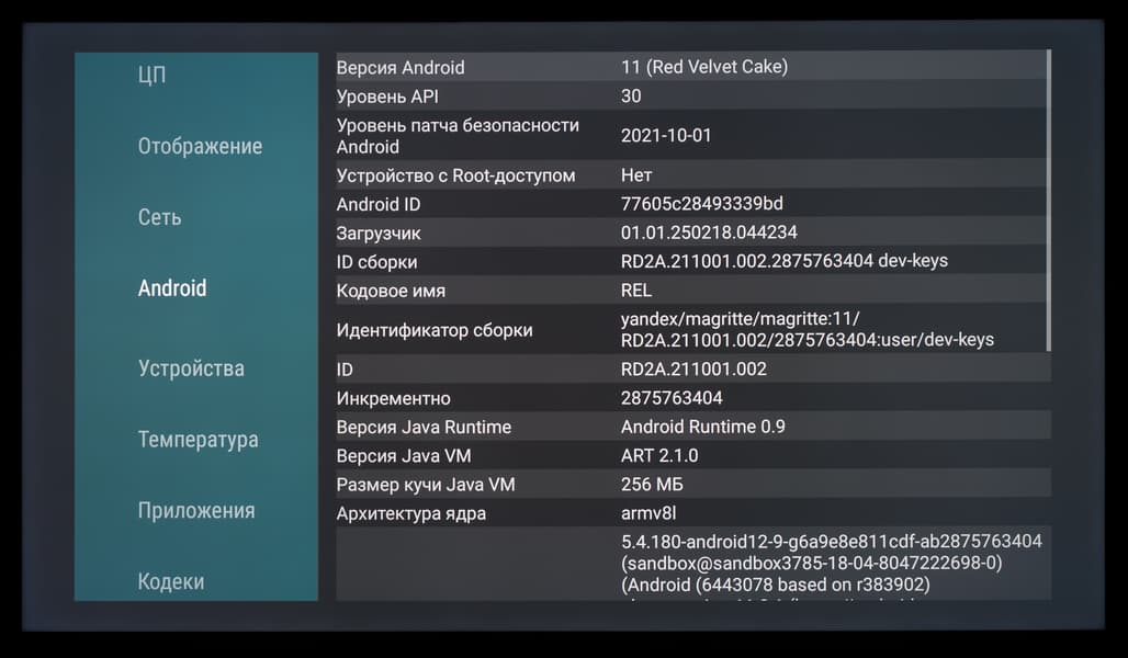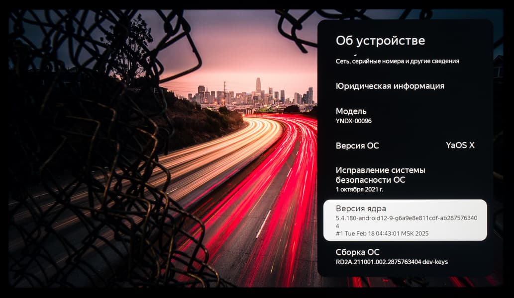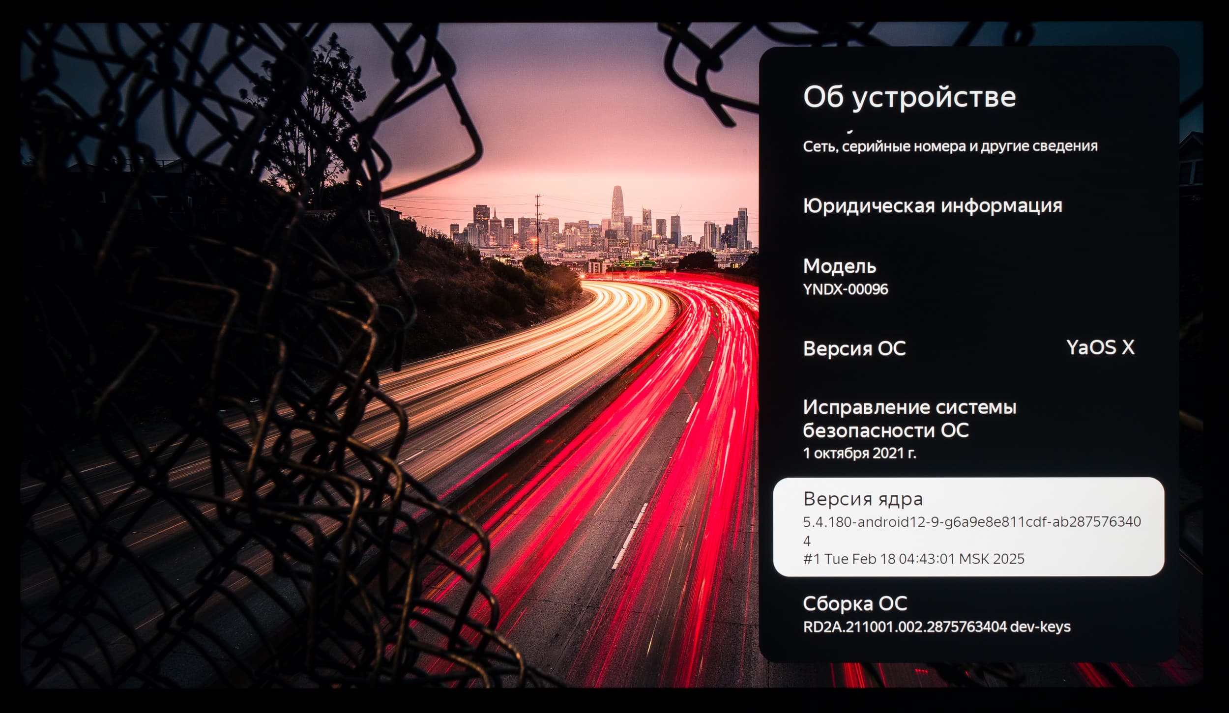 Рассматриваемый телевизор «Яндекс ТВ Станция» работает под управлением собственной платформы YaOS X, в данном случае основанной на Android версии 11 в виде свободно распространяемой AOSP (Android Open Source Project). За время своего существования (уже более 3 лет) система визуально похорошела, ускорилась, избавилась от многих проблем и ошибок. А полноценная интеграция YandexGPT принесла приставку X к названию платформы. Перед началось тестирования телевизора система была обновлена до последней доступной версии (апрель 2025 года).
