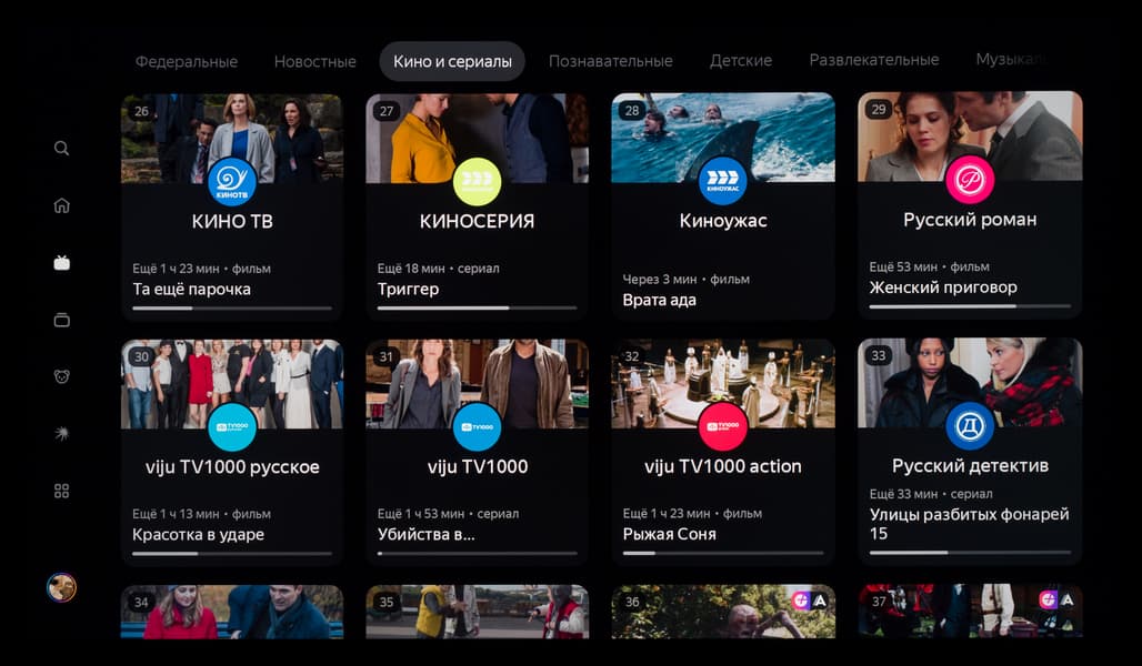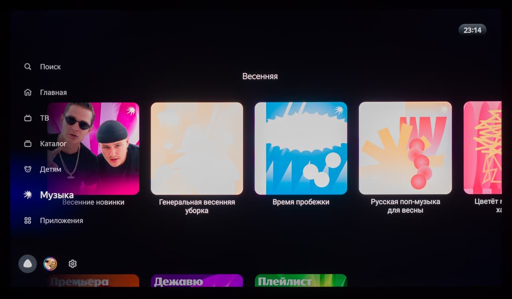 В разделе «Каталог» можно найти все основные рекомендации по просмотру фильмов, сериалов и развлекательных программ, есть специальные подборки по темам/категориям. Для прослушивания музыки оболочка предлагает воспользоваться встроенным плеером сервиса «Яндекс Музыка», куда после захода в аккаунт уже будет загружена вся ваша музыка (все подборки и плейлисты) — доступ предлагается в разделе «Музыка».