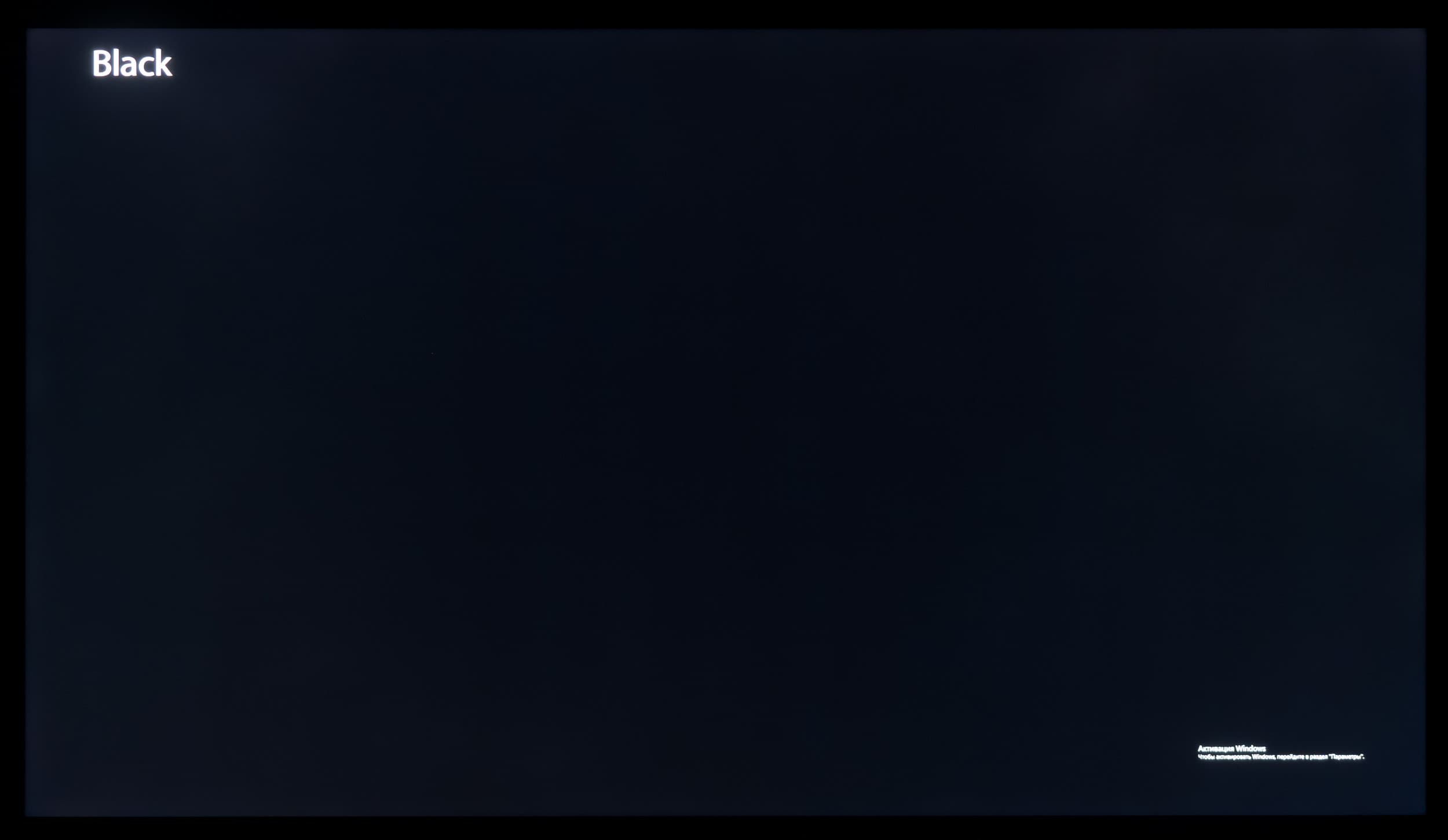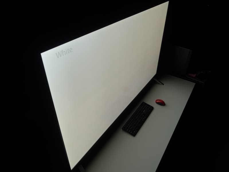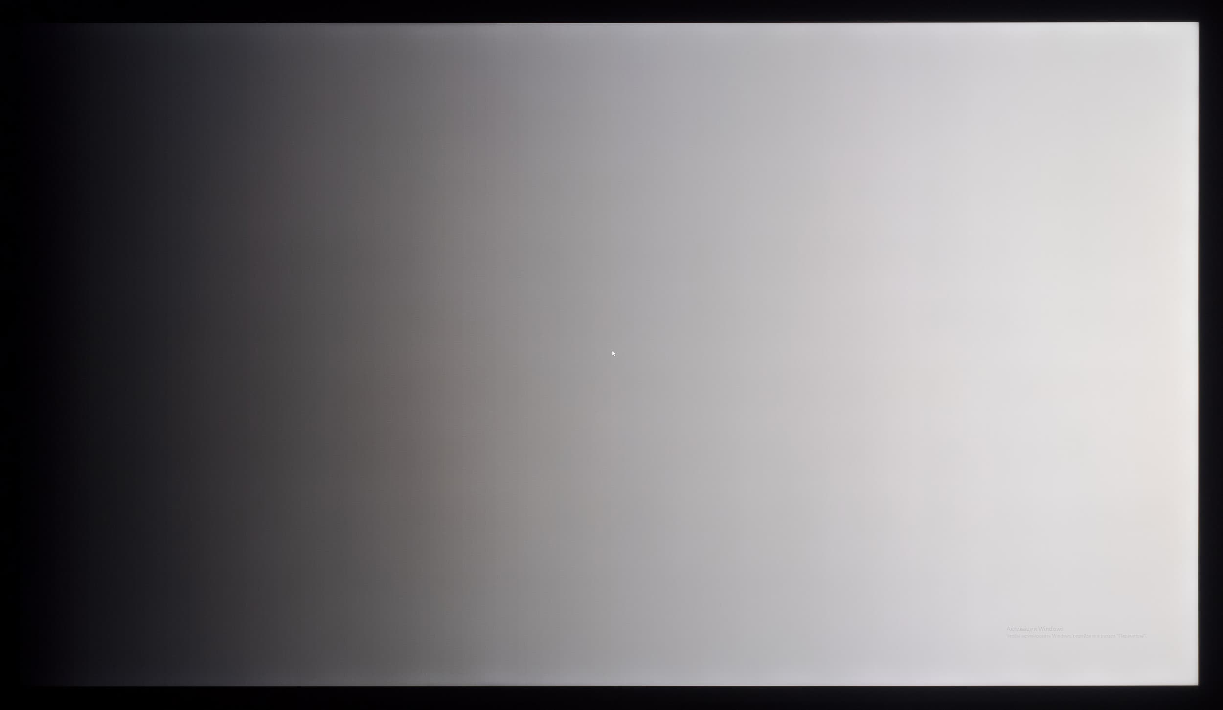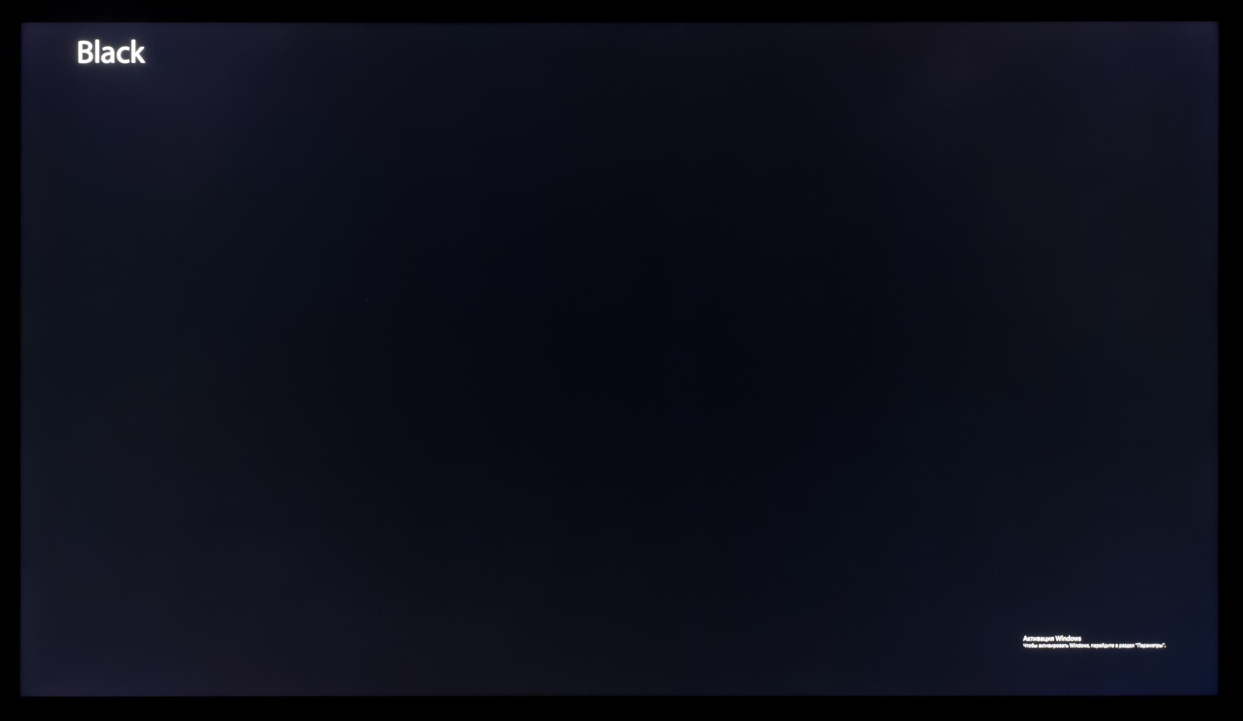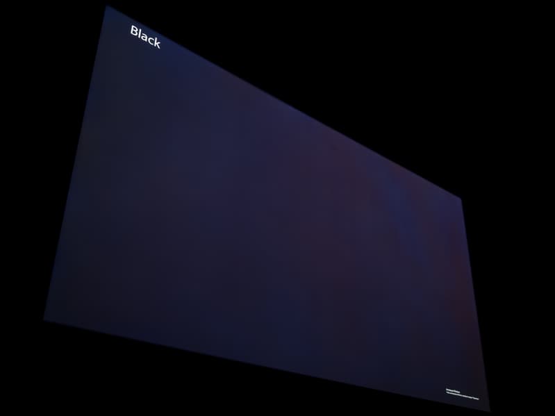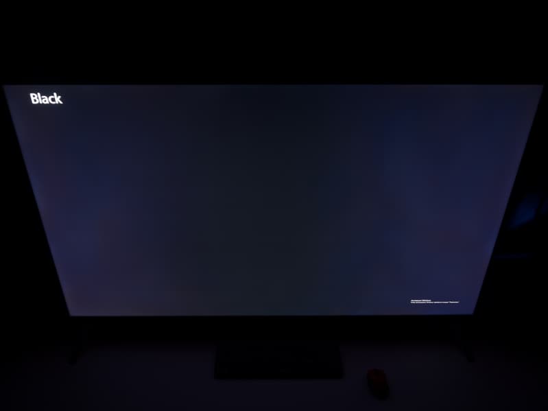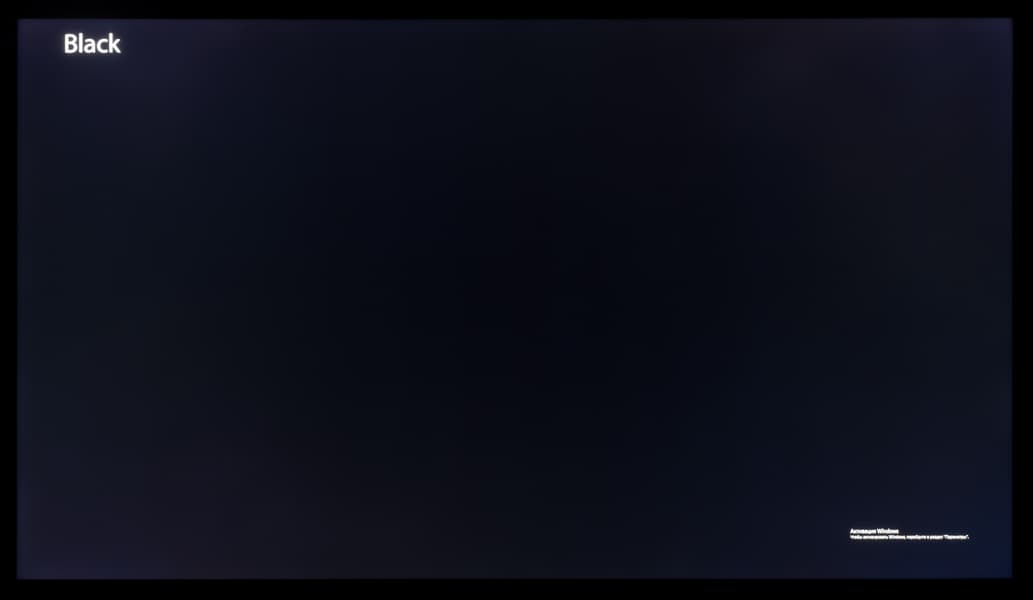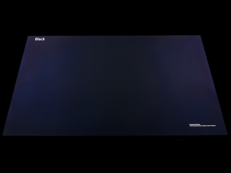 При выводе черного поля равномерность подсветки оказалась очень хорошей, без визуально выраженных дефектов однородности по полю матрицы, что подтверждает вторая фотография, сделанная с расстояния до экрана в 3 метра.