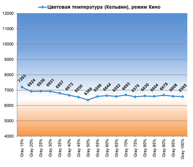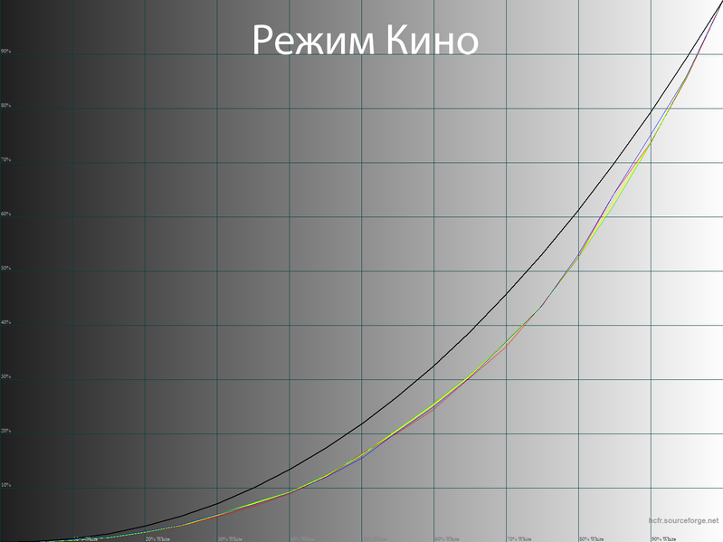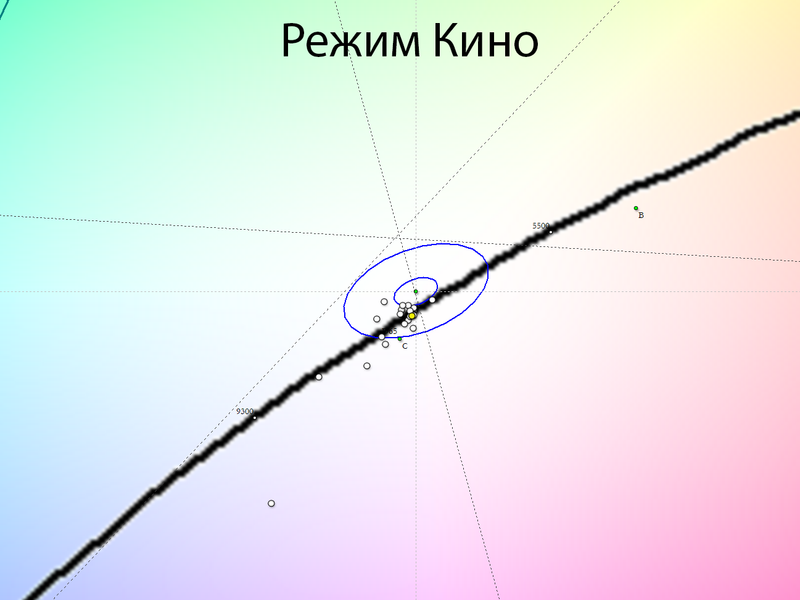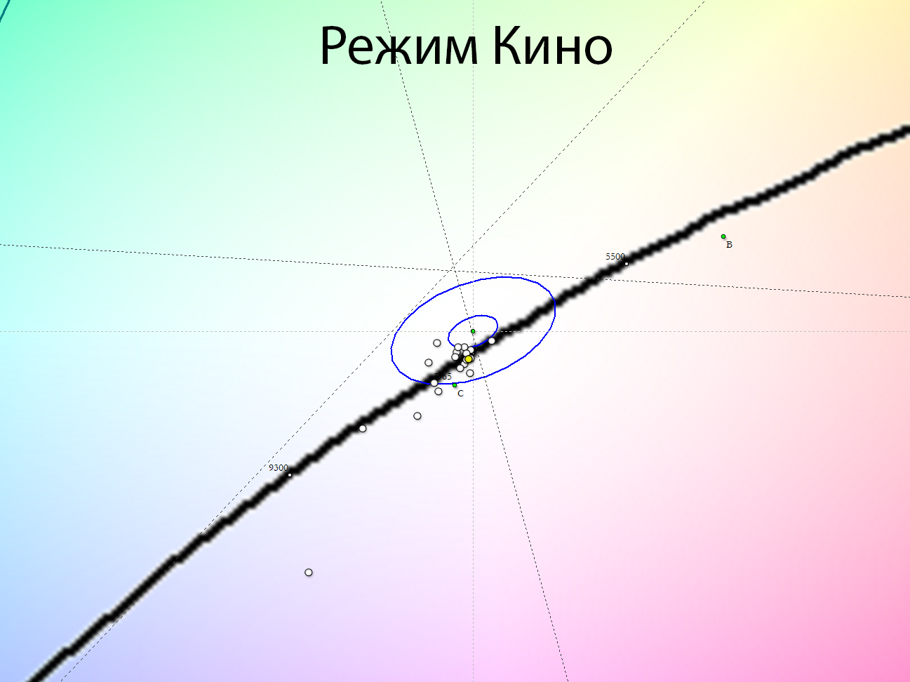 При активации специального режима «Кино» дополнительное подмешивание компонент для сужения цветового охвата не происходит. Меняется лишь базовая настройка цветовой температуры.