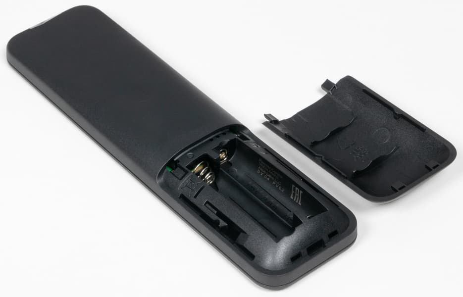 Основным элементом управления «ТВ Станции QLED» выступает достаточно компактный пульт ДУ. Он изготовлен из черного пластика с матовой поверхностью. Черные кнопки с обозначением функций белой краской изготовлены из резиноподобного материала. Нажатия мягкие и слегка смазанные.