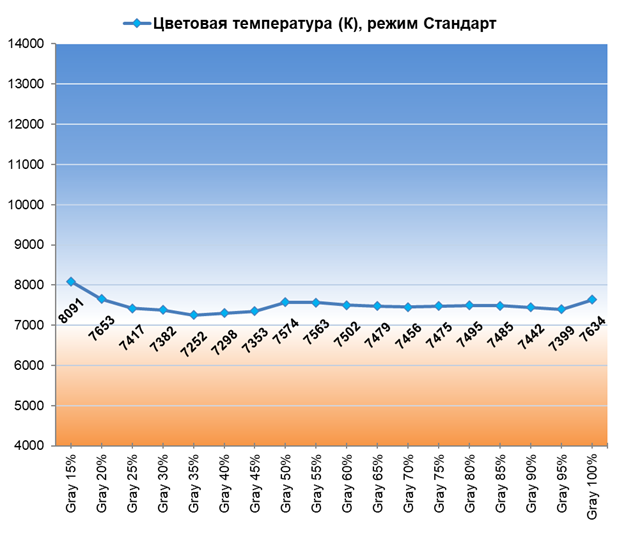 По полученным гамма-кривым при настройках по умолчанию можно судить о слегка сниженной контрастности изображения в сравнении с референсом, но адекватной различимостью глубоких теней. Среднее значение гаммы для режима составило 2,22.