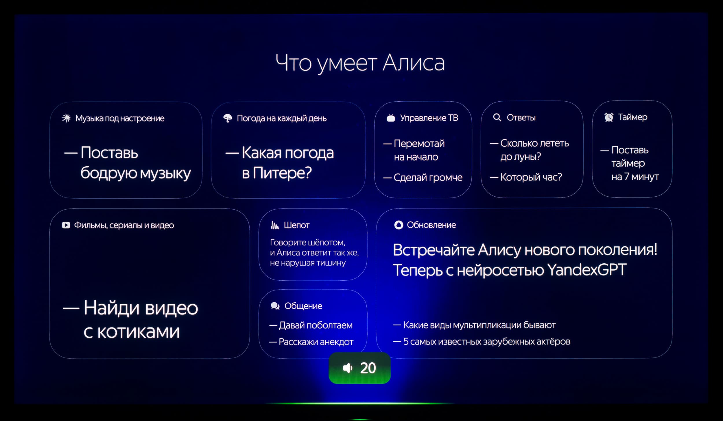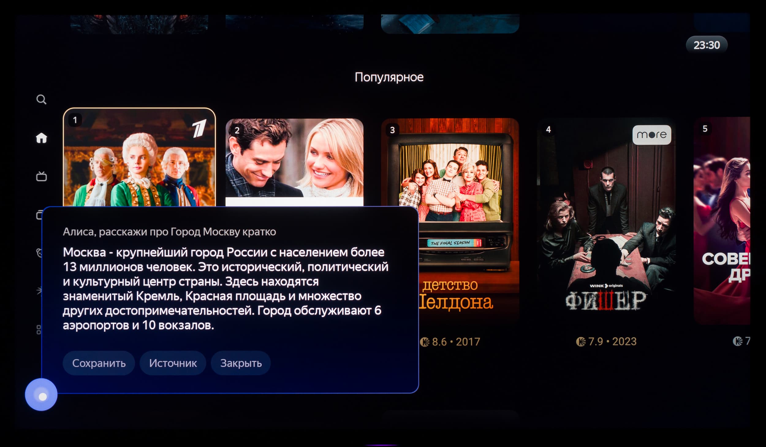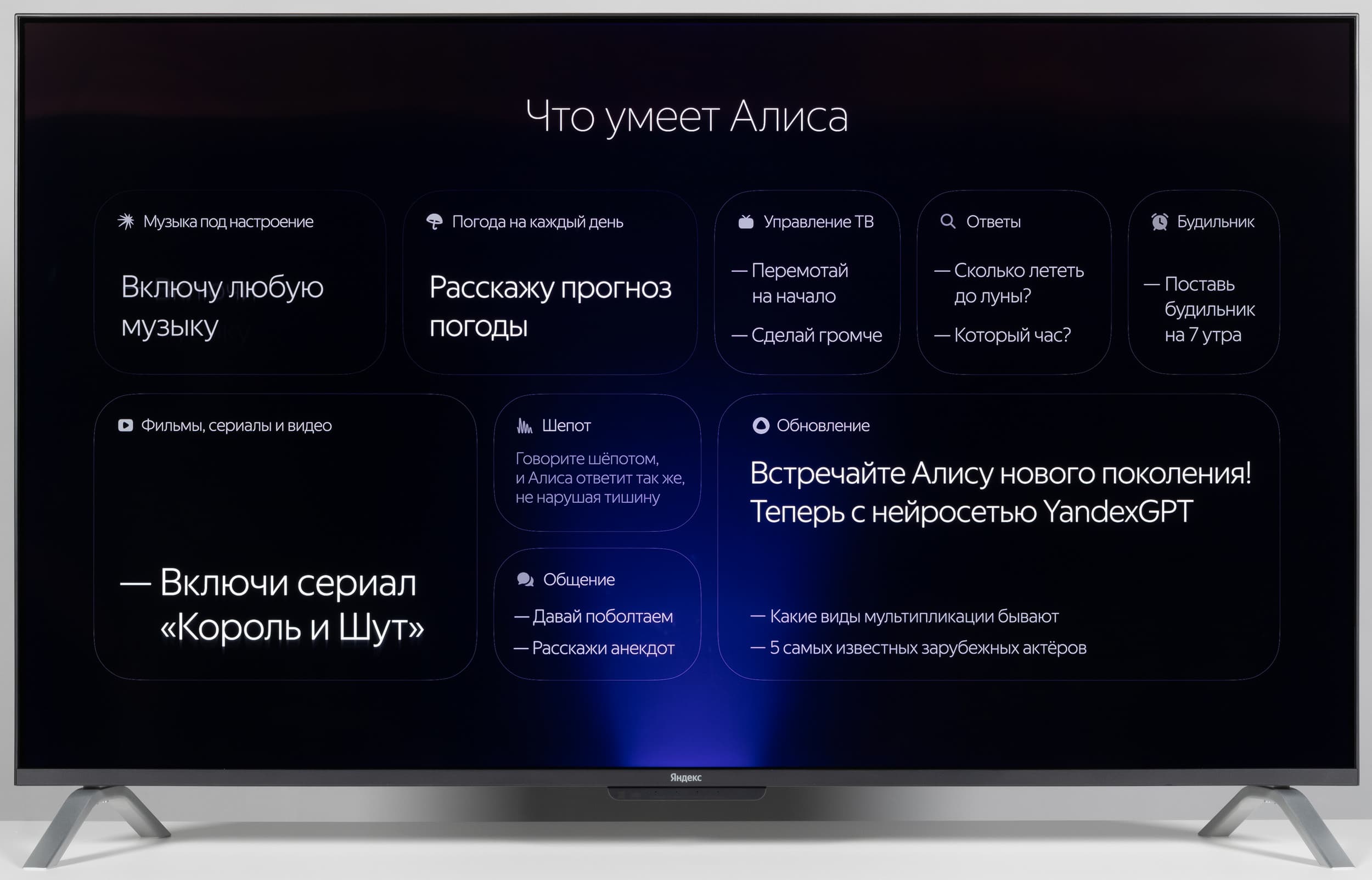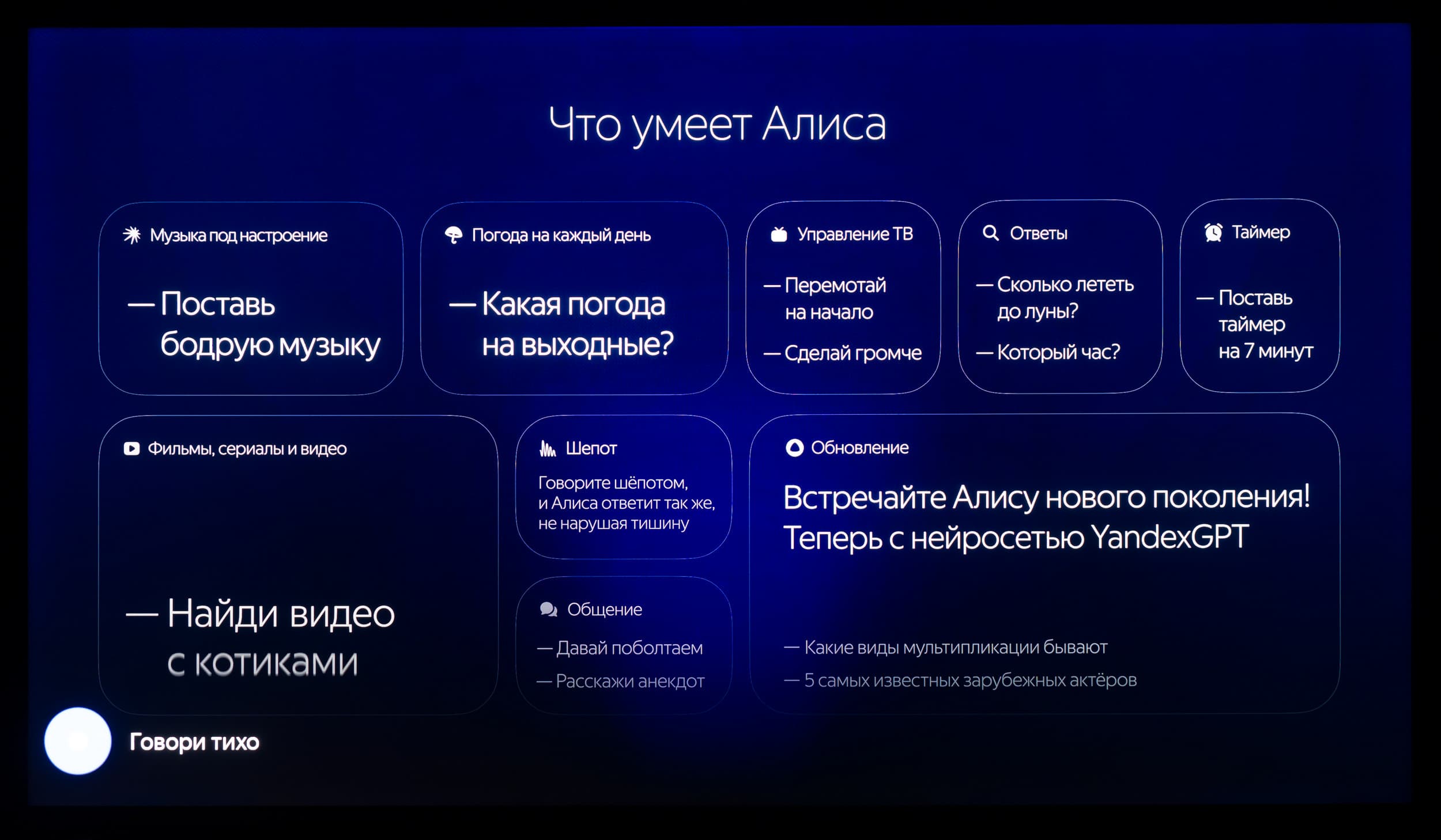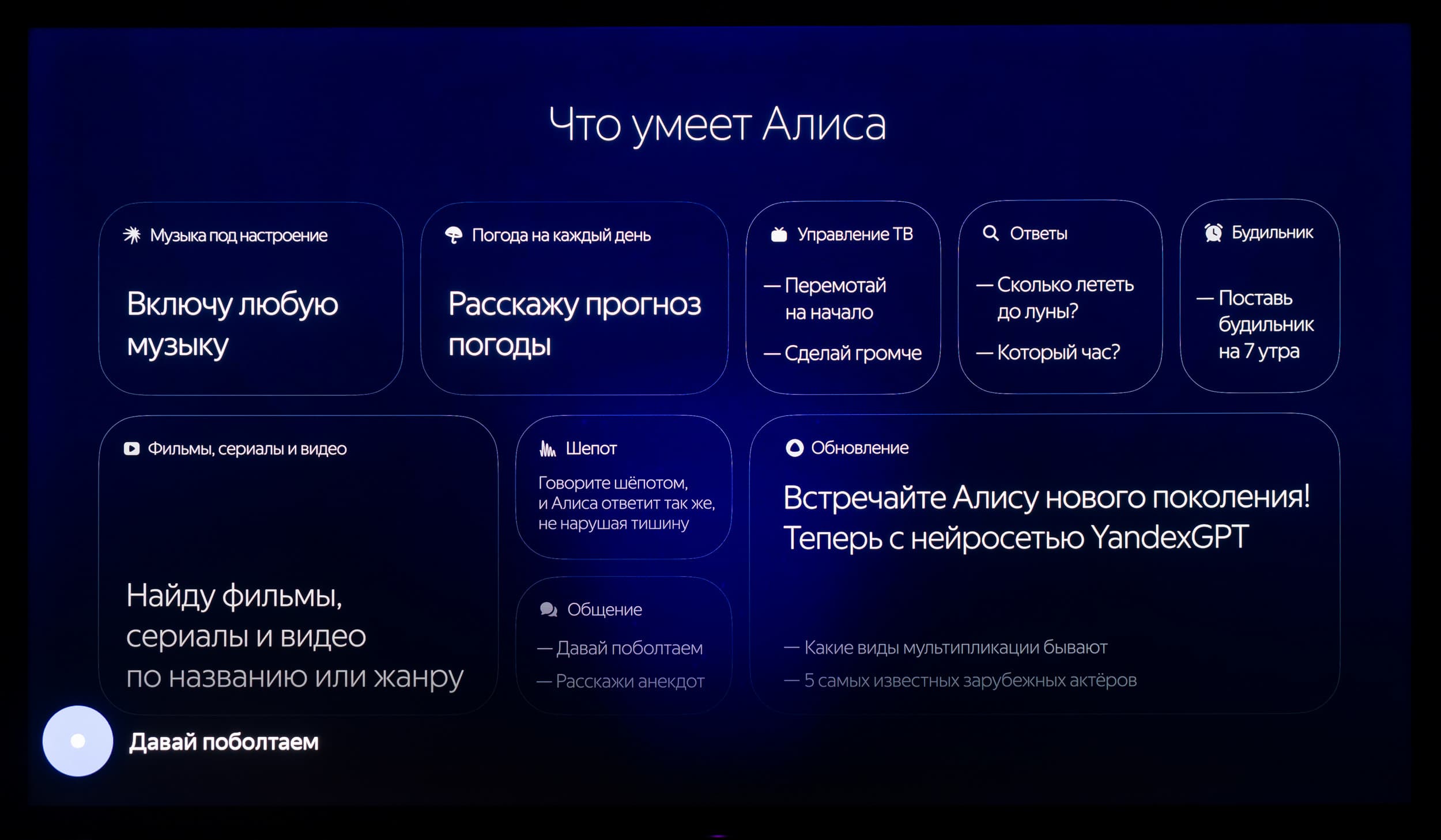 Эта передовая нейронная сеть уже в пятой генерации позволяет Алисе предоставлять более подробные ответы, обрабатывать различные стили и выполнять инструкции с несколькими условиями. Благодаря ей виртуальный помощник становится более эффективным в решении сложных задач, создании изображений, написании более качественных и информативных текстов. Впрочем, многое из этого более актуально при работе с системой с телефона, ПК или ноутбука, но вряд ли с экрана ТВ. Запросы во всех этих случаях, как вы понимаете, будут часто отличаться.