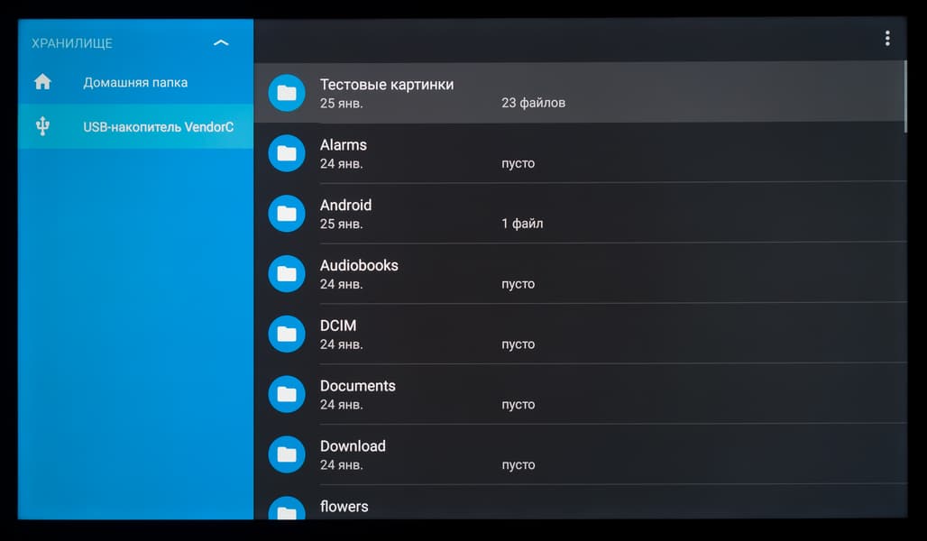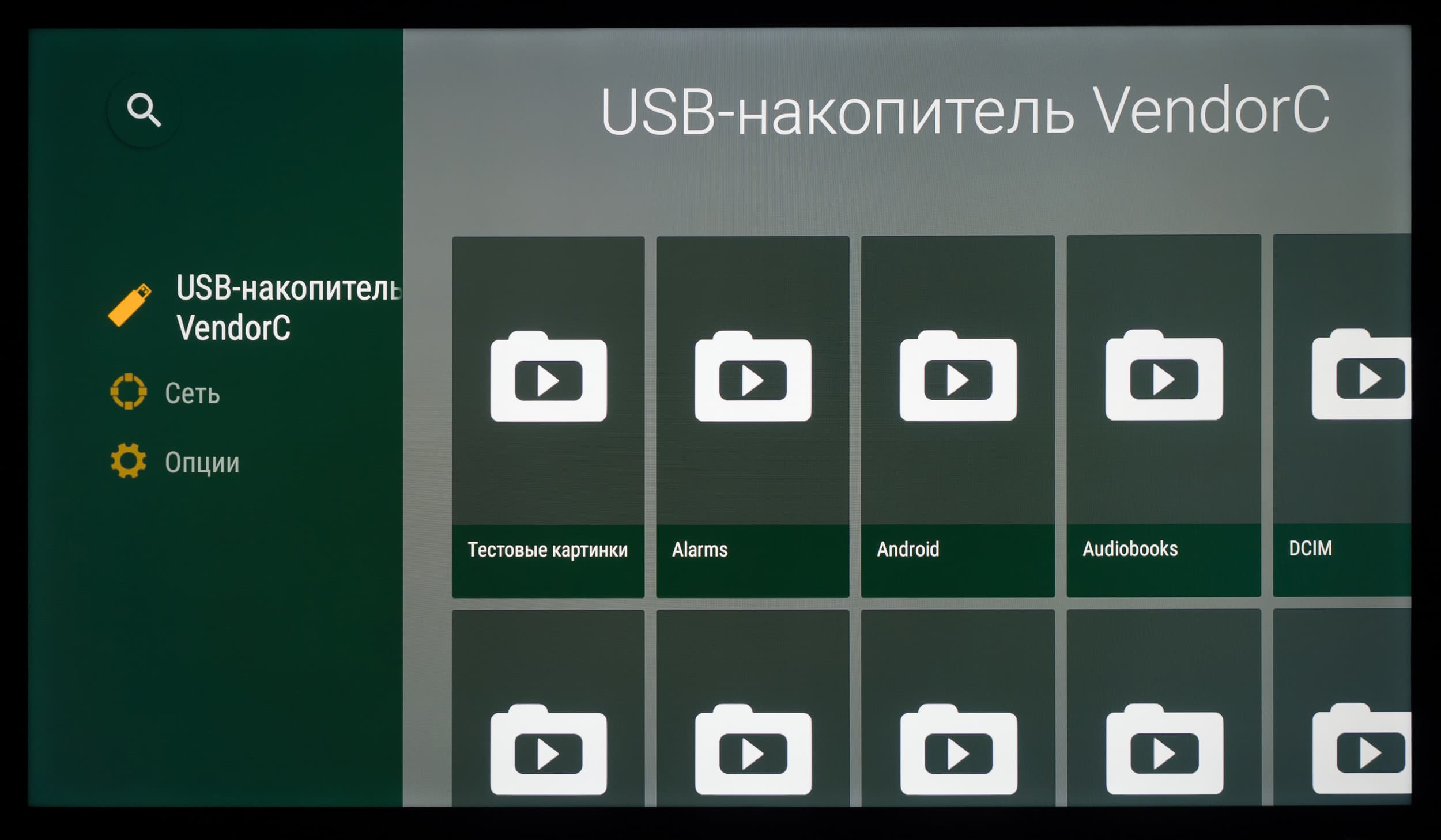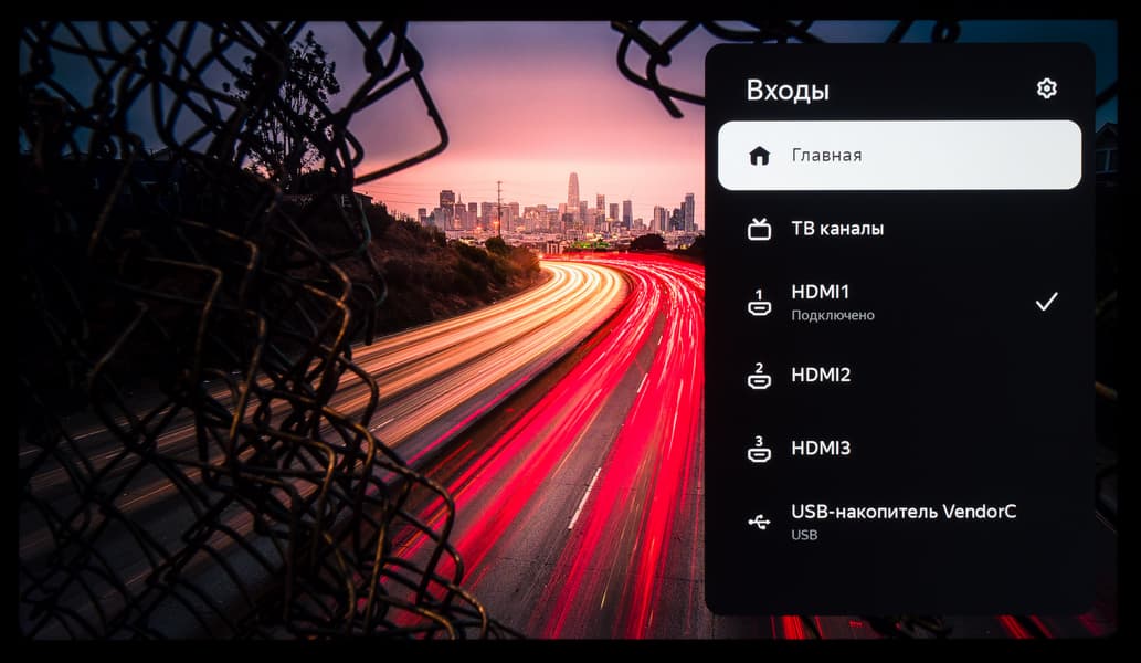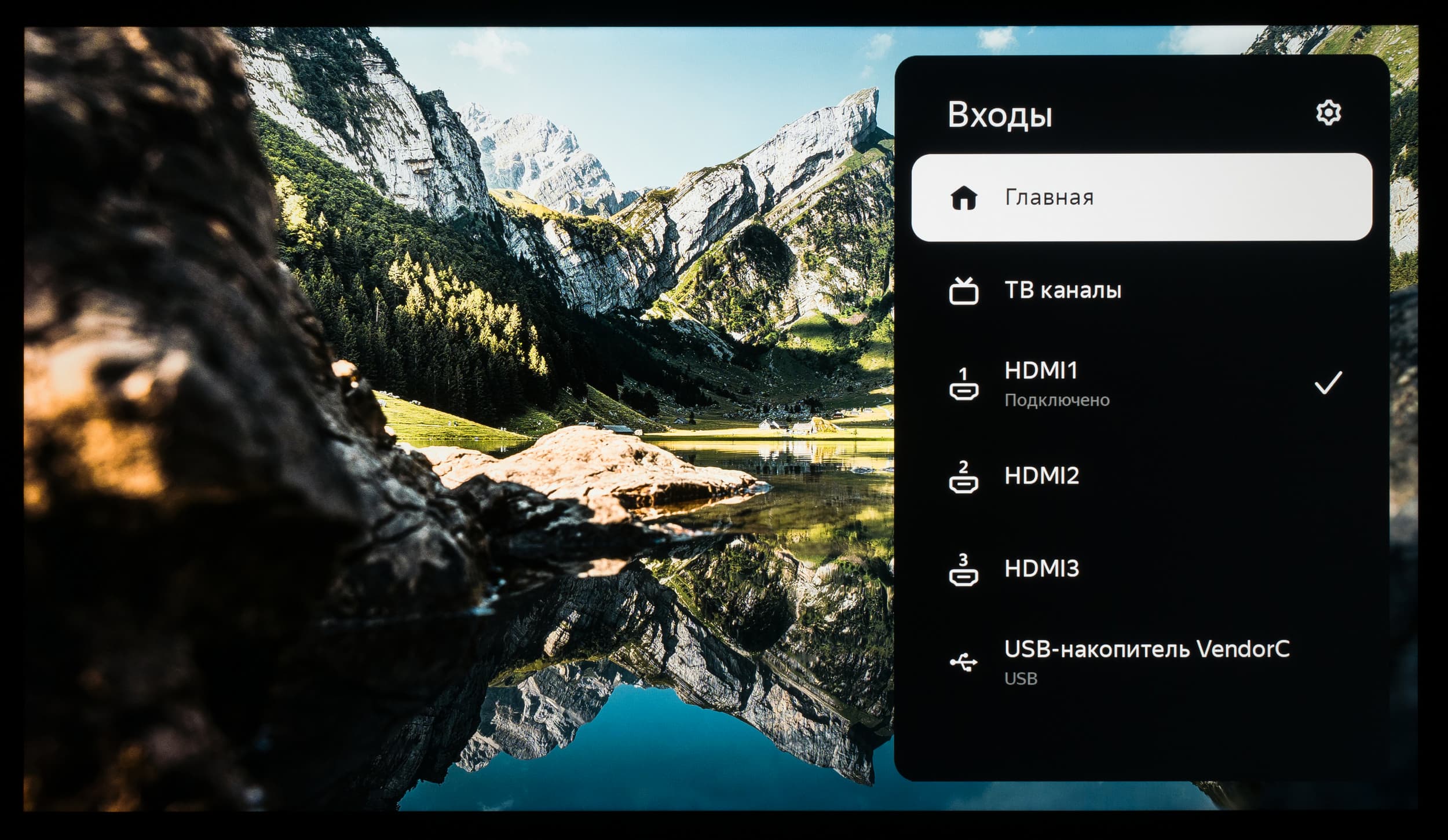 Через отдельный блок «выбор источника», вызываемого соответствующей клавишей на пульте ДУ, можно не только выбрать один из трех HDMI-портов, но и перейти сразу к файлам на подключенном USB-накопителе или к разделу с ТВ-каналами, а также на главную страницу ОС.