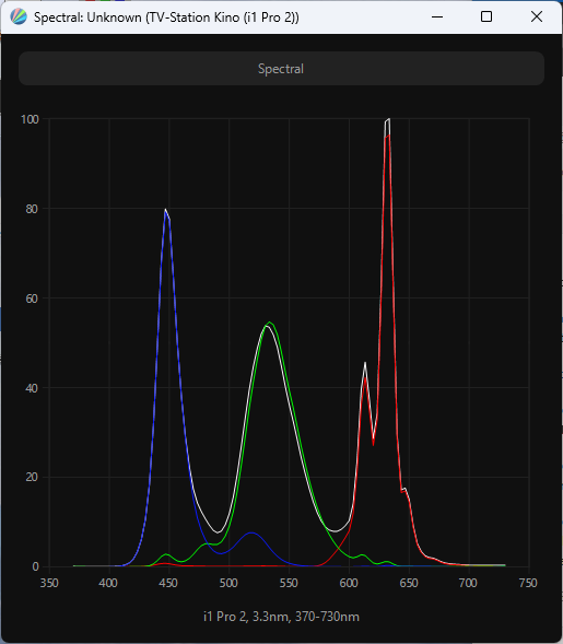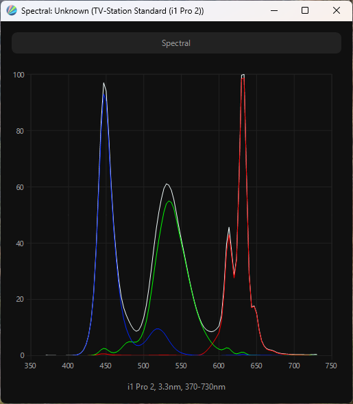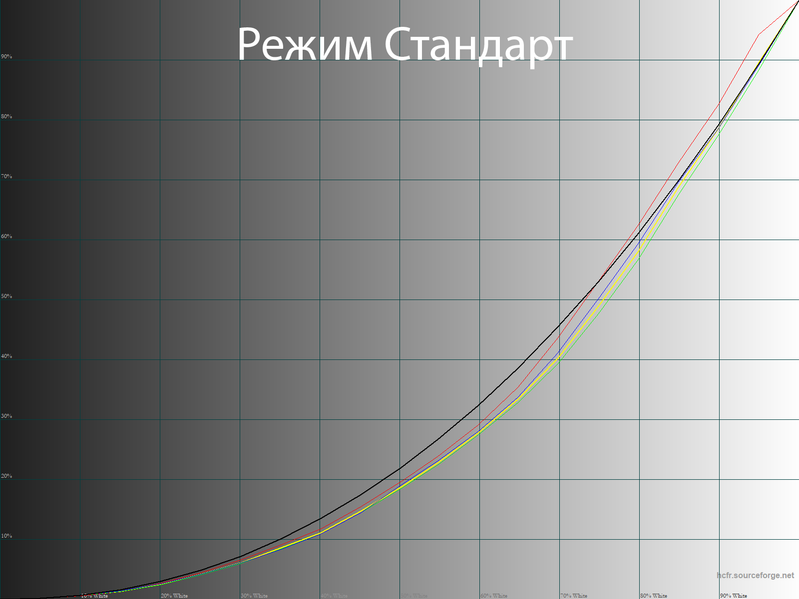 Ниже приведен спектр для белого поля (белая линия), наложенный на спектры красного, зеленого и синего полей (линии соответствующих цветов) для режима экрана «Стандарт» с полной цветовой гаммой: