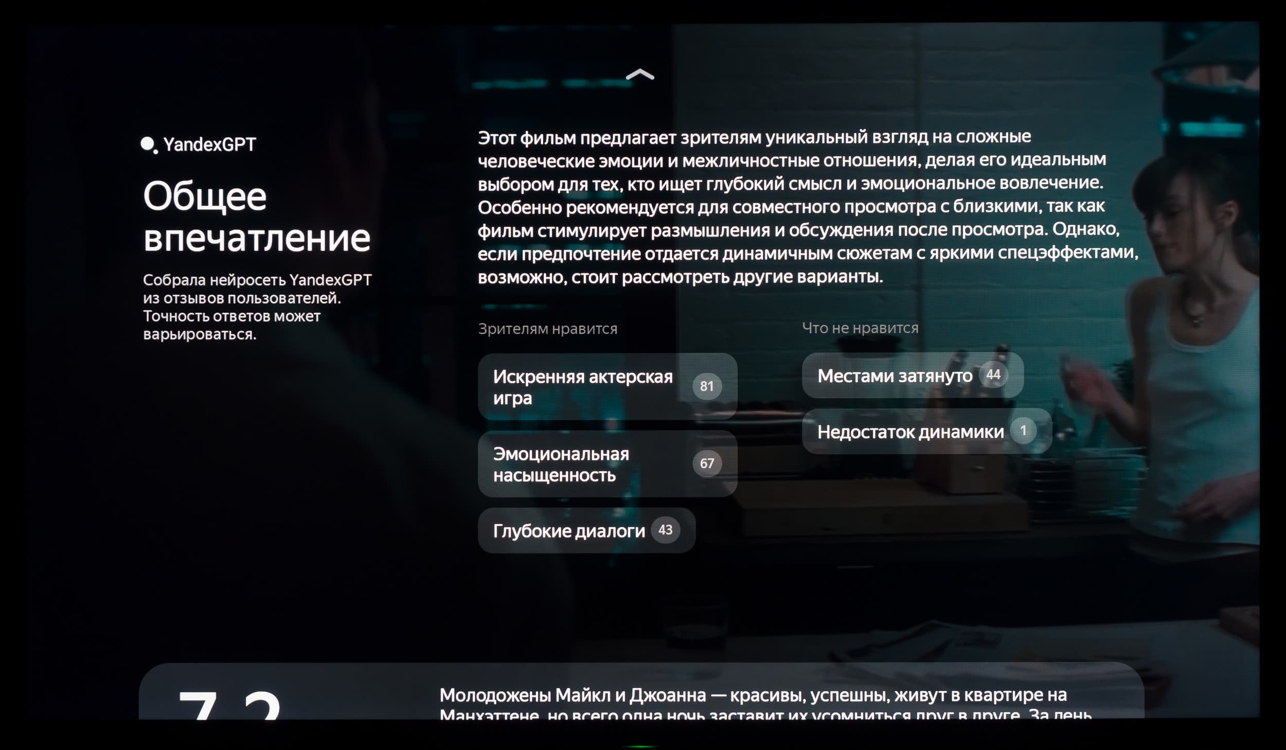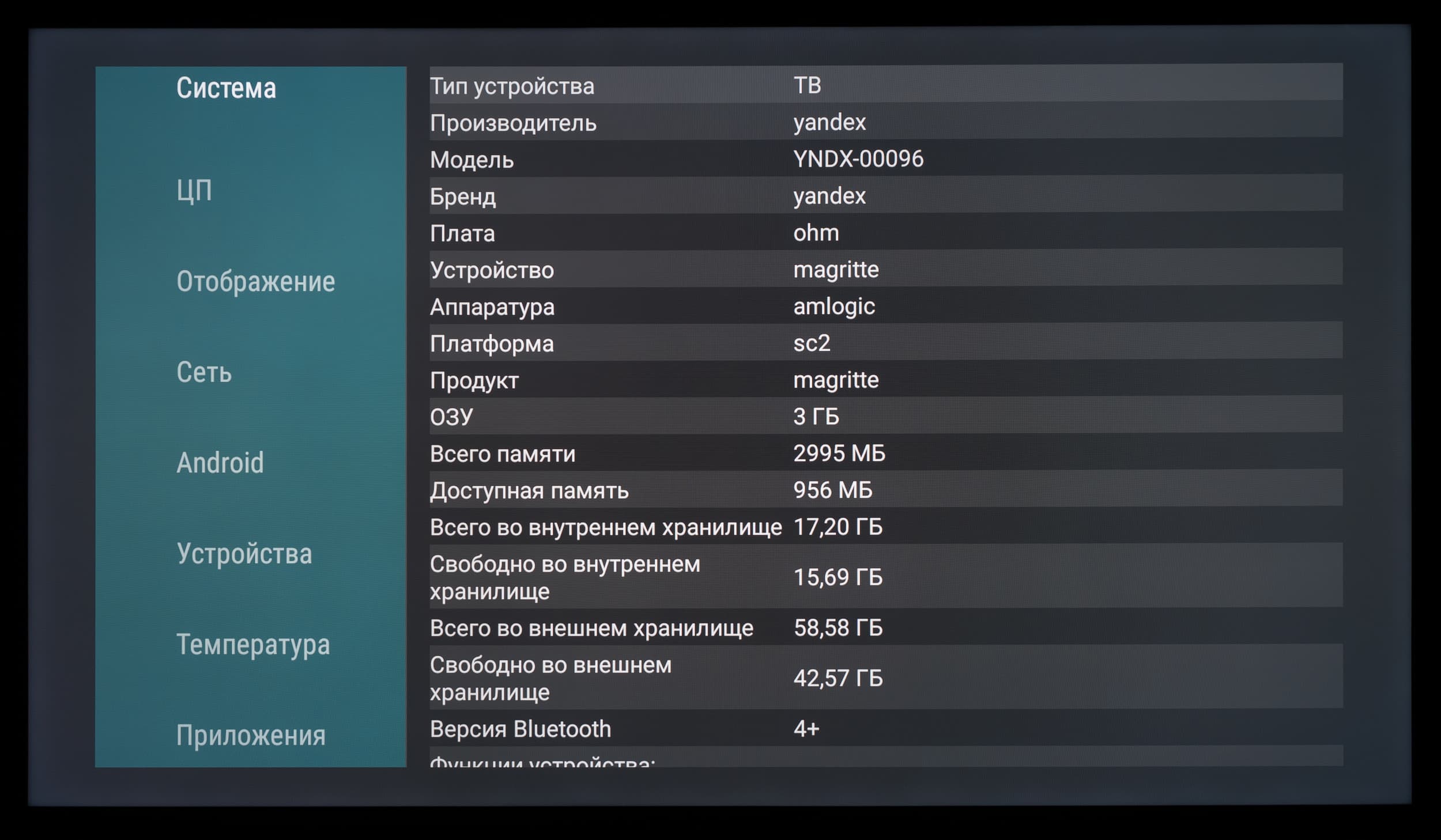«Яндекс» планомерно старается перевести массы пользователей на использование исключительно своей экосистемы: собственная оболочка, «Умный дом», «Кинопоиск», «Яндекс Музыка», Yandex GPT/Pro, сильно ограниченный встроенный магазин приложений (но это не ограничивает вас в установке сторонних файлов .apk), отсутствие входов под антенну и кабельное ТВ, отсутствие слота под CI-модуль. С точки зрения компании, всё должно быть онлайн, и желательно иметь источником сервисы самого «Яндекса». Подход известный и дающий хорошие плоды именитым западным брендам.