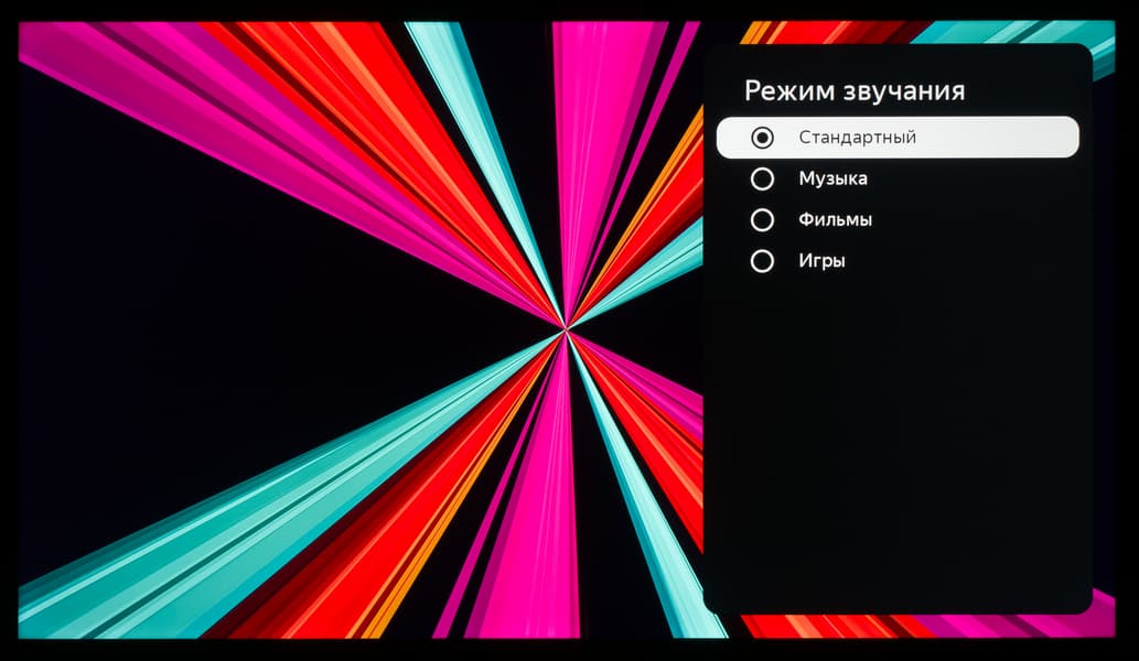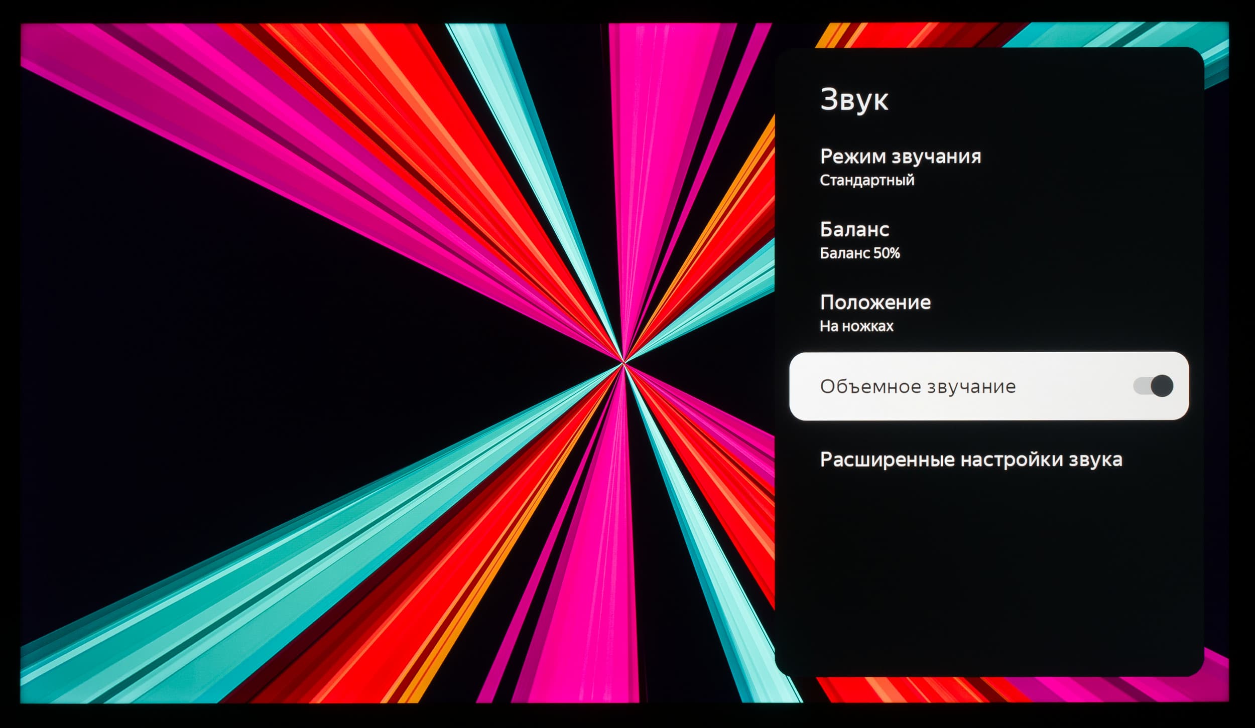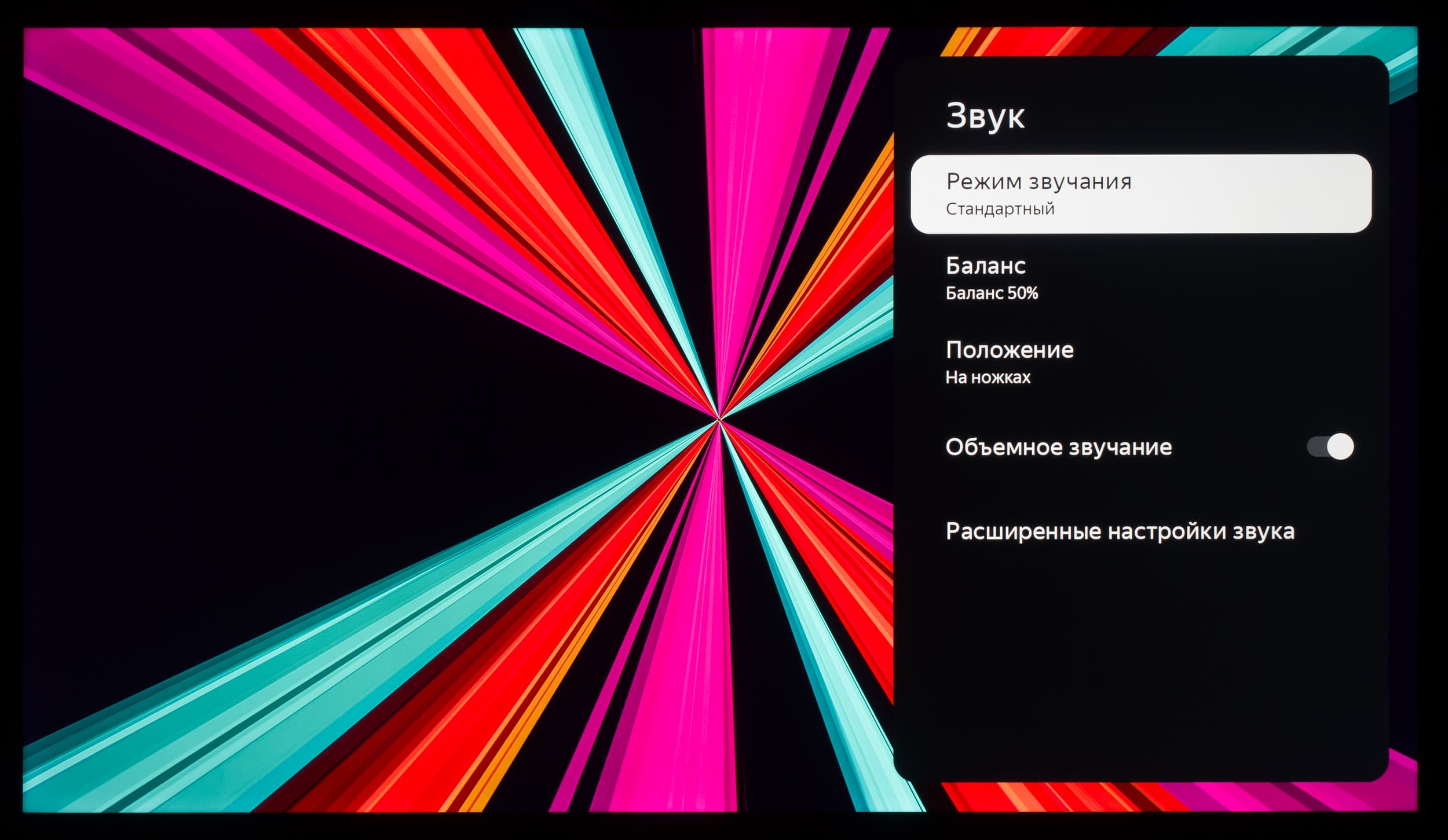 В разделе «Звук» операционной системы есть предустановленные режимы эквалайзера (четыре доступных варианта), а также доступна ручная регулировка баланса, активация функций «Объемное звучание» (она действительно делает его чуть более объемным и с более правильным балансом частот — видимо относится к функции Yandex AQ), выбор варианта расположения ТВ в пространстве для внутренних коррекций звукового сигнала.