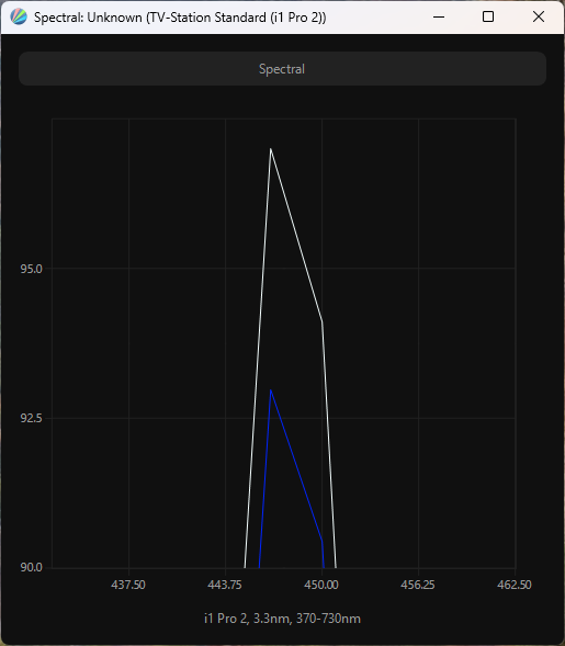 Виден классический пик синего, приходящийся на 446-447 нм, что неспособно обеспечить экран различными современными сертификатами безопасности. Перекрестное подмешивание компонент незначительное. Есть более выраженные пик красного в сравнении с классической W-LED-подсветкой, что теоретически свидетельствует об использовании модификатора спектра свечения (красный фосфор либо те самые светочувствительные «квантовые точки» одного конкретного размера — QLED, как называют это в индустрии ТВ и мониторов). В такой ситуации можно рассчитывать на полное покрытие стандартного цветового пространства sRGB и некоторый выход за его границы, особенно в области с красными и фиолетово-розовыми полутонами.