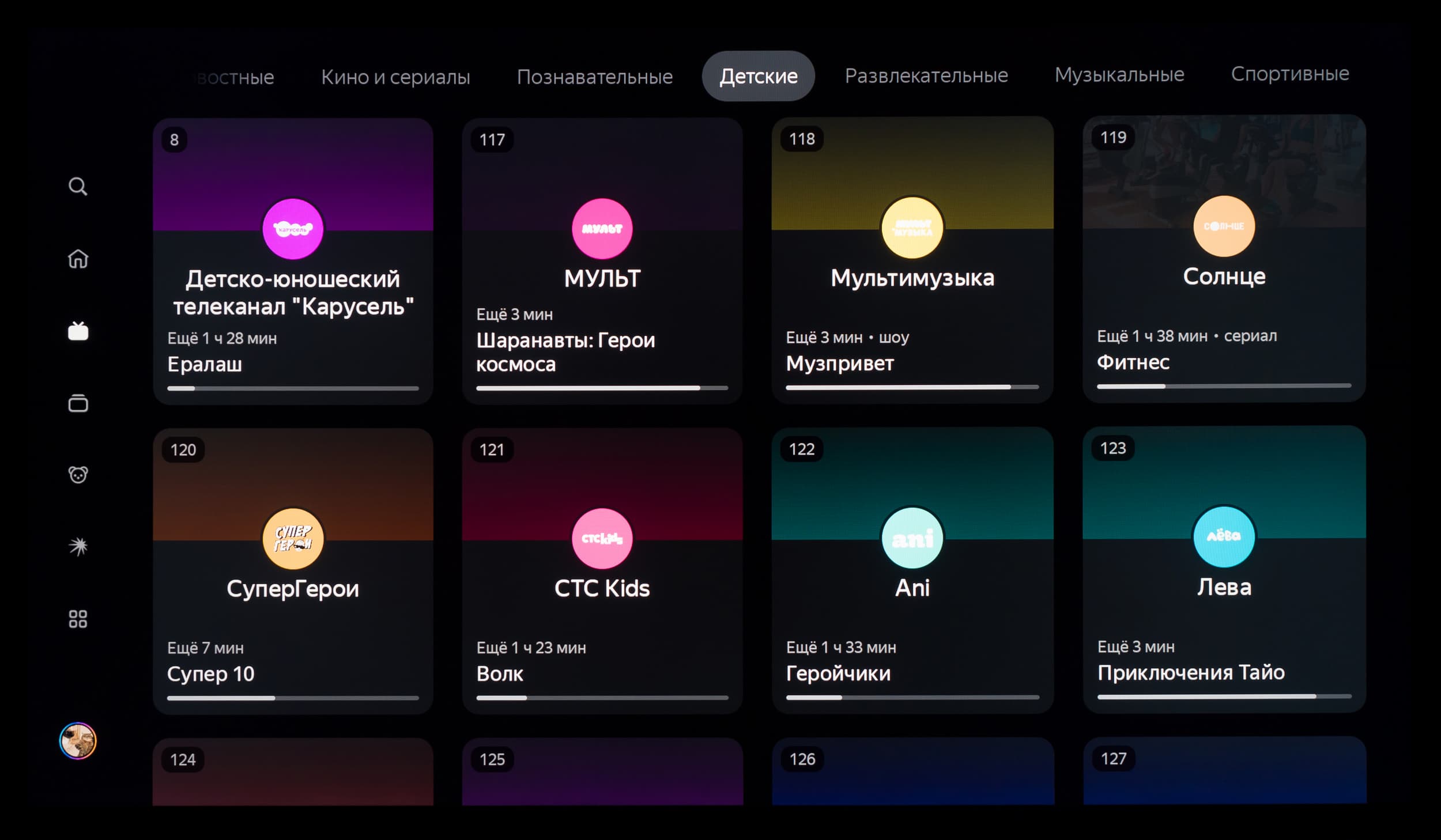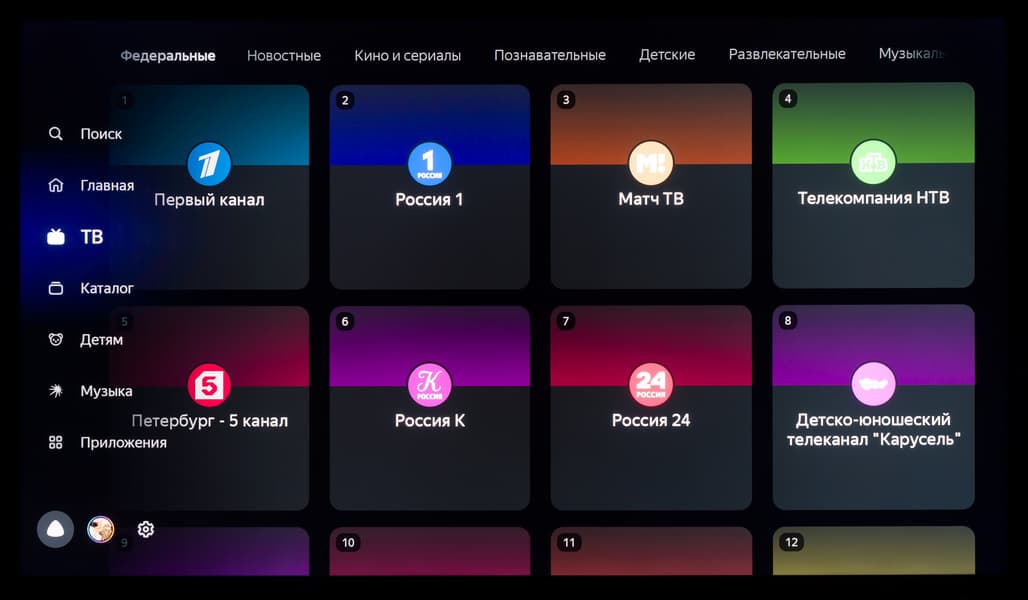 Меню на домашней странице позволяет перейти к вводу поискового запроса (самый первый раздел главного меню), к списку телевизионных каналов (интернет-телеканалы, IPTV) для просмотра которых антенна не нужна (входа под нее у героя обзора и нет) — именно такой формат использования новинки и предполагают в «Яндексе». Каналы отсортированы по множеству категорий, имеют свои иконки и краткое описание.
