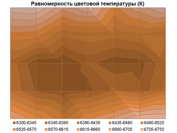 Не возникло особых вопросов и к равномерности цветовой температуры: среднее отклонение от центральной точки составило 2,4%, максимальное — 6,1%. Вариация ЦТ оказалась на уровне 450 К, что будет сложно заметить при реальном использовании 65-дюймового экрана ТВ.