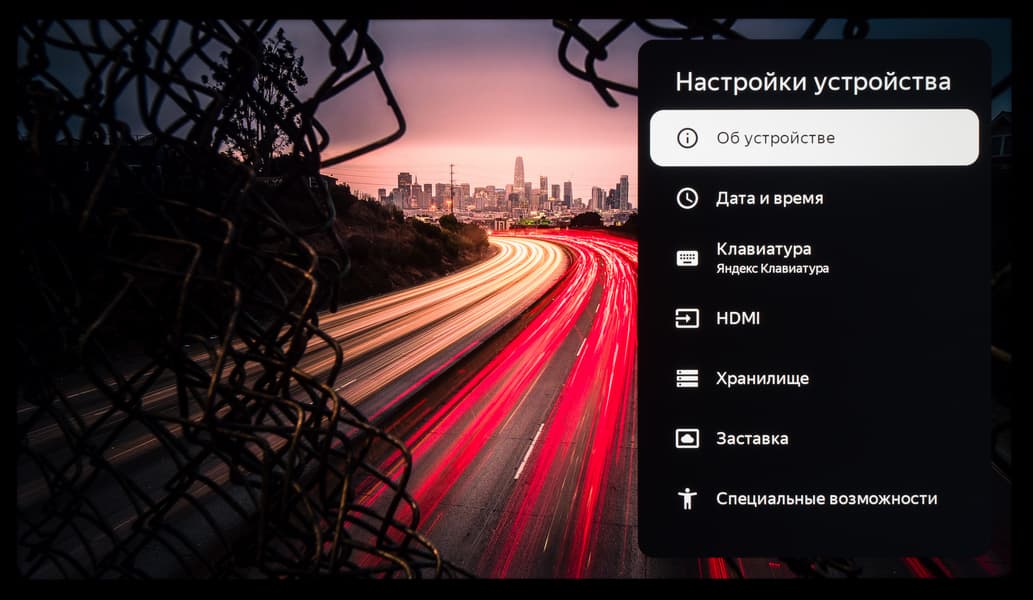 В разделе «Настройки устройства» представлены подразделы с информацией об устройстве, настройки даты и времени, выбор экранной клавиатуры (по умолчанию установлена «Яндекс Клавиатура»), включение расширенного режима для портов HDMI (требуется активация для получения 60 Гц при работе с ПК и некоторыми сторонними источниками подключения) и управление CEC и eARC, настройка и включение заставки, управление хранилищем (встроенным накопителем), включение субтитров и контрастного текста.